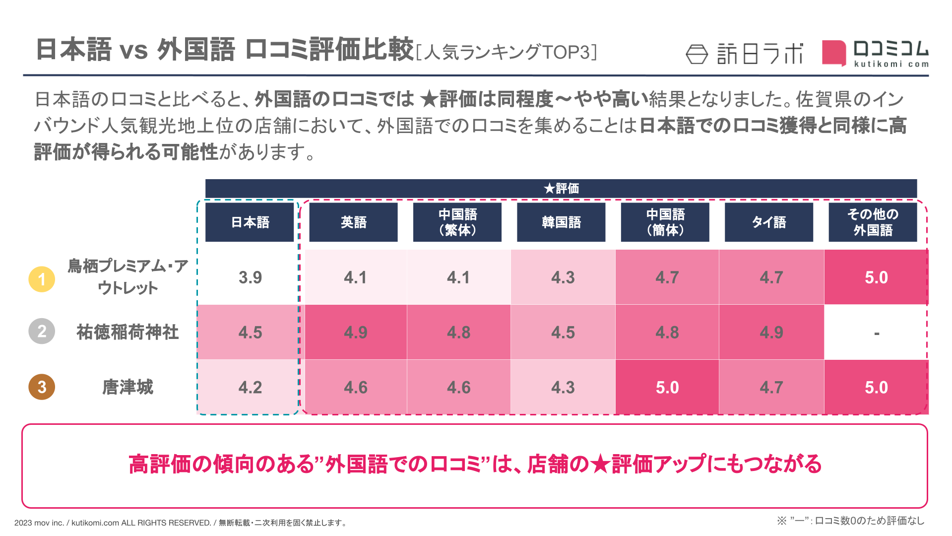 日本語の口コミと比べると、外国語の口コミでは★評価は同程度〜やや高い結果となりました。佐賀県のインバウンド人気観光地上位の店舗において、外国語での口コミを集めることは日本語での口コミ獲得と同様に高評価が得られる可能性があります。