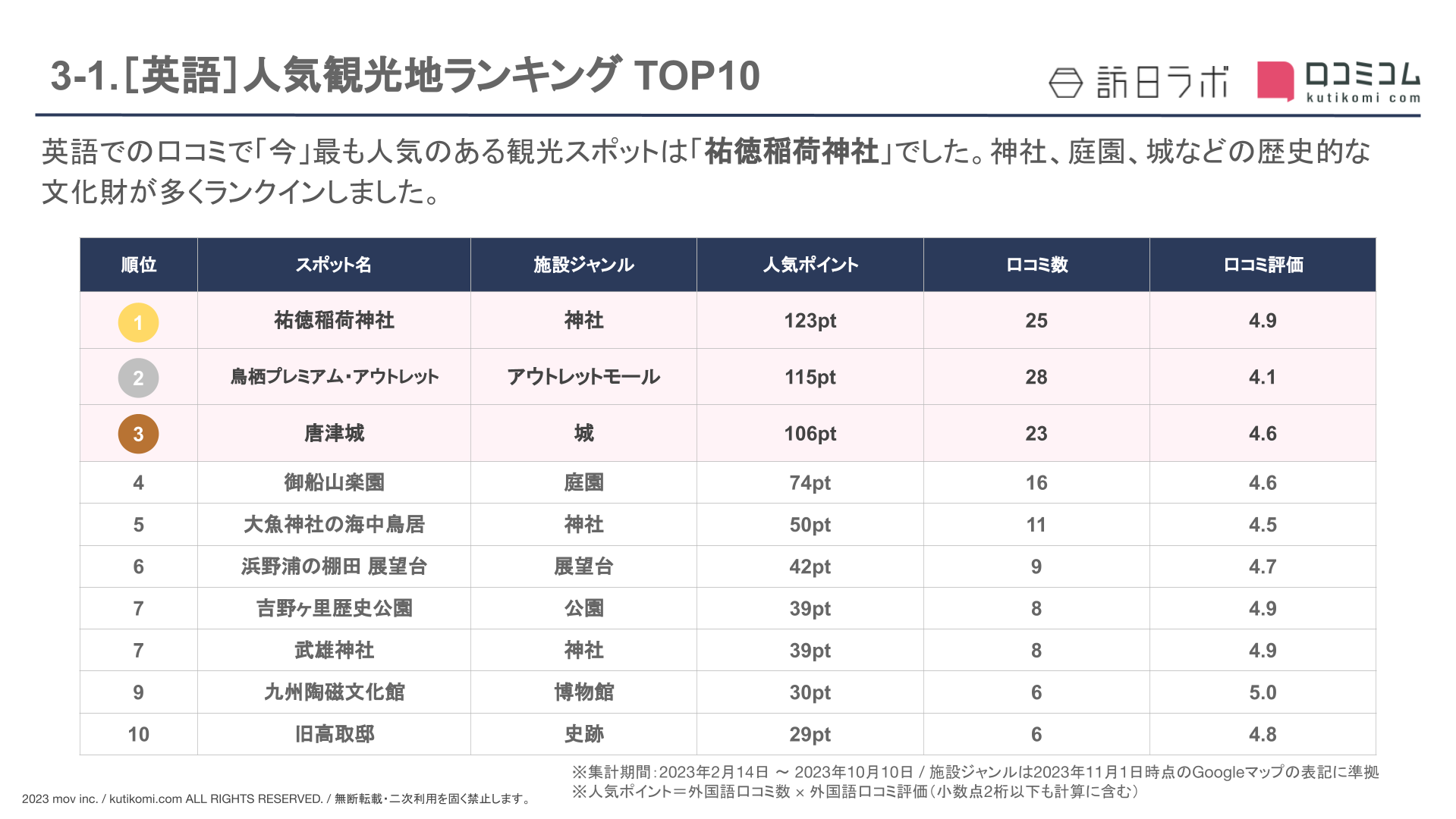 人気観光地ランキングTOP3のスポットはいずれも人気ポイントが400ptを超え、100件近い外国語口コミを獲得しました。