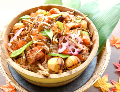 【秋鮭 と旬のキノコ、栗のホクホク炊き込みご飯】