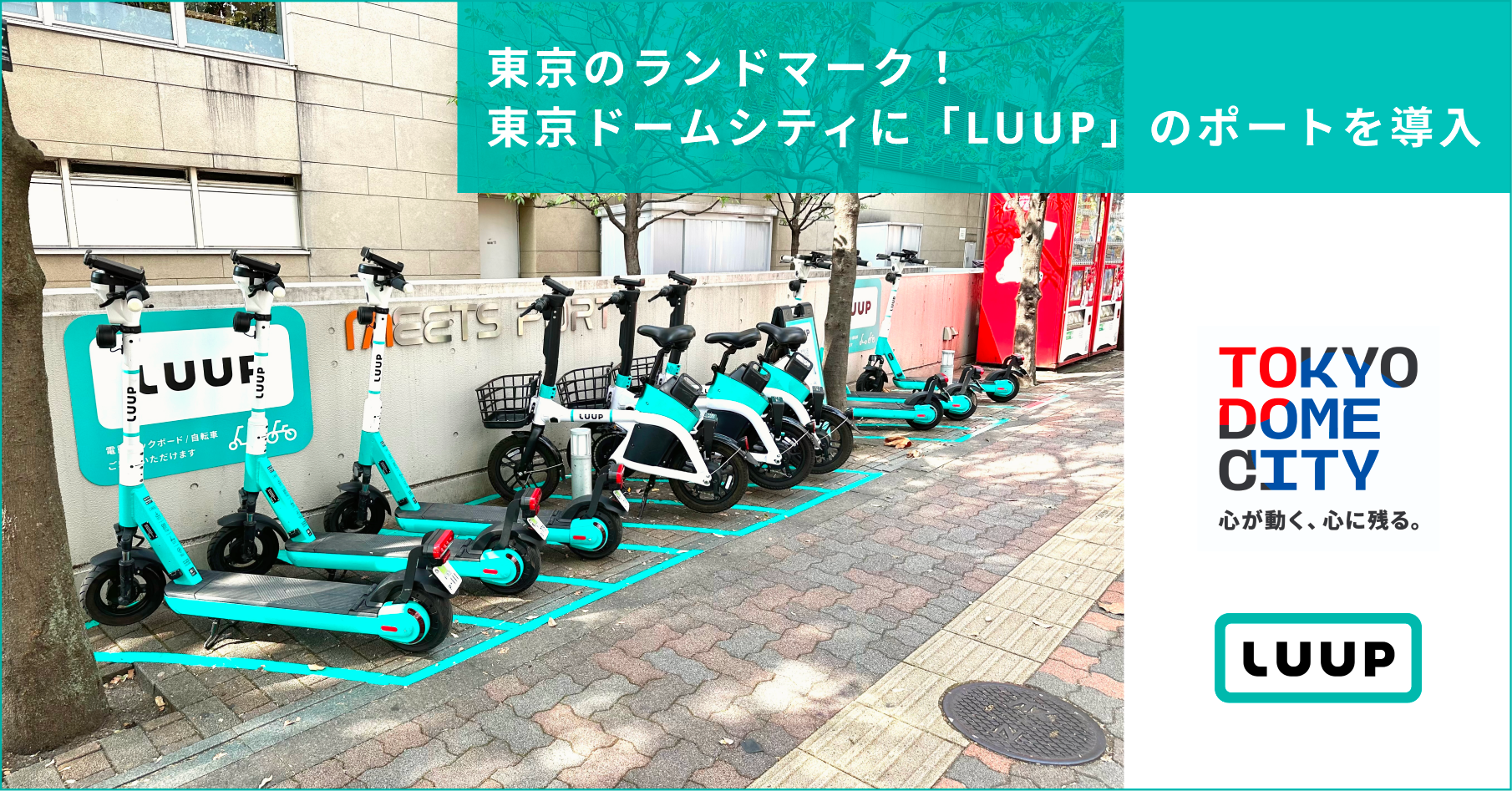 株式会社Luup(本社:東京都千代田区、代表取締役社長兼CEO:岡井大輝、以下「Luup」)は、株式会社東京ドーム(本社:東京都文京区、代表取締役社長 COO:長岡勤)が運営する東京ドームシティのミーツポート(所在地:東京都文京区後楽1丁目3-61)に電動マイクロモビリティのシェアリングサービス「LUUP(ループ)」のポートを導入し、2023年10月18日(水)より利用可能となったことをお知らせします。