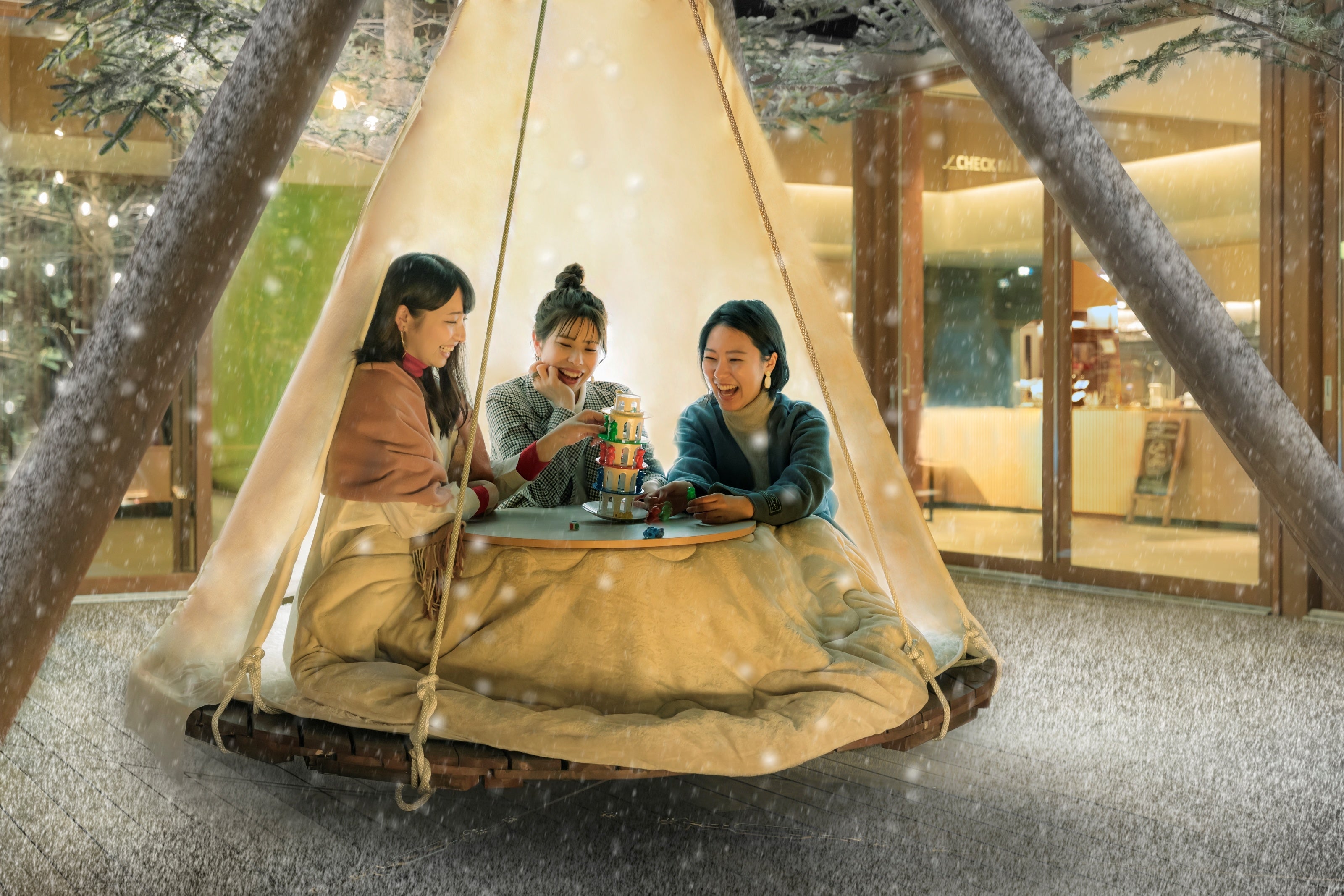 軽井沢の冬は、毎年氷点下になります。寒い地域として有名な軽井沢ですが、凛とした空気や静けさがとても素敵な時期です。BEB5軽井沢では、冬の軽井沢の魅力を存分に感じてもらいたいと思い、あえて外に出たくなるよう屋外にこたつを設置しました。昨年とても好評だった「ゆらゆら空中こたつ」に加えて、今年は新たに「ブランコこたつ」も仲間入りします。軽井沢の冬の雰囲気を感じながら、仲間とぬくぬく、こたつ滞在を楽しめます。