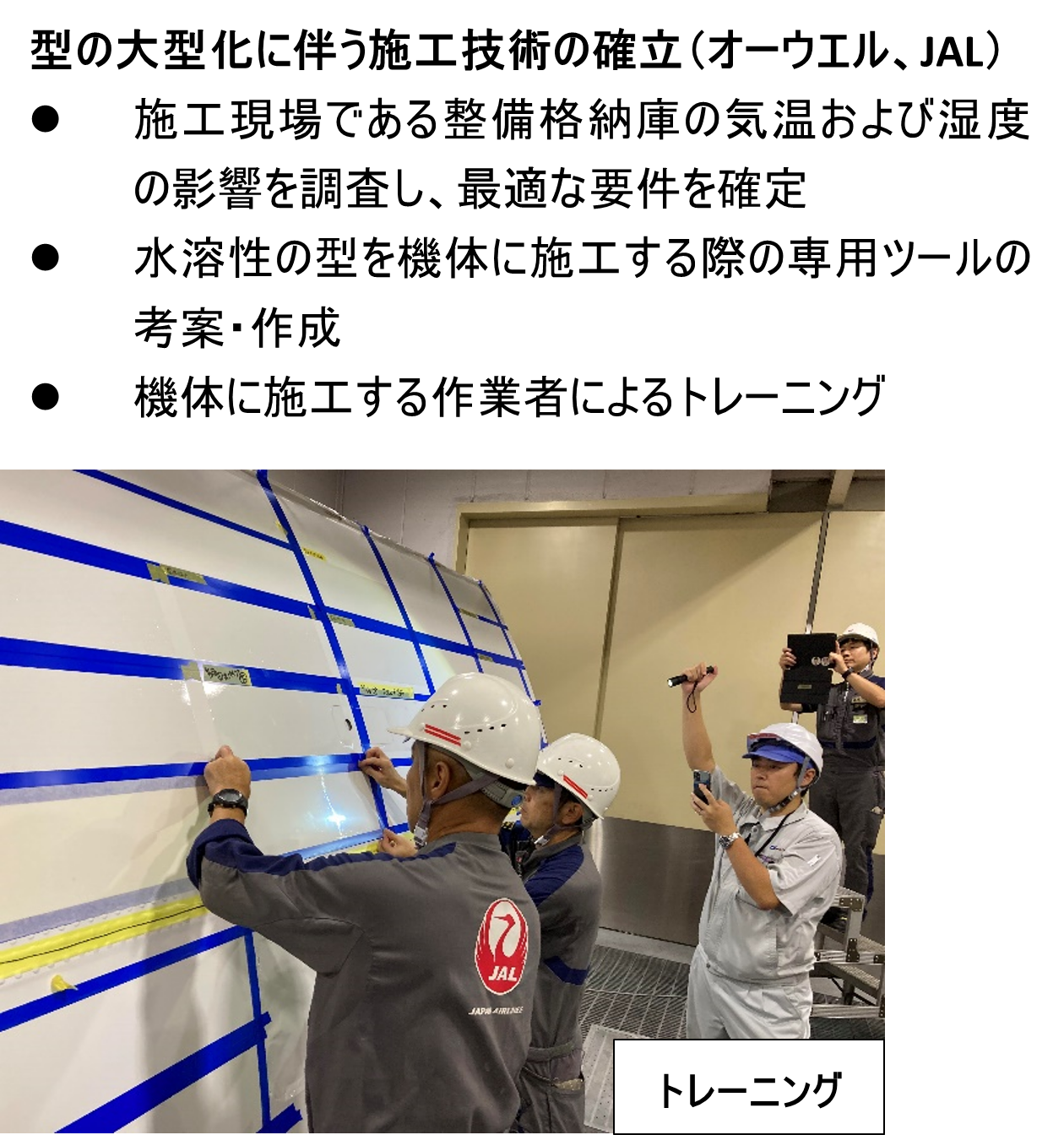 航空機の大面積への施工を実現するためには、水溶性の型の大型化、大型化に伴う施工技術の確立といった課題を解決したうえで、施工箇所・面積を確定する必要があり、JAL、JAXA、オーウエルにて最適な方法を検証してきました。