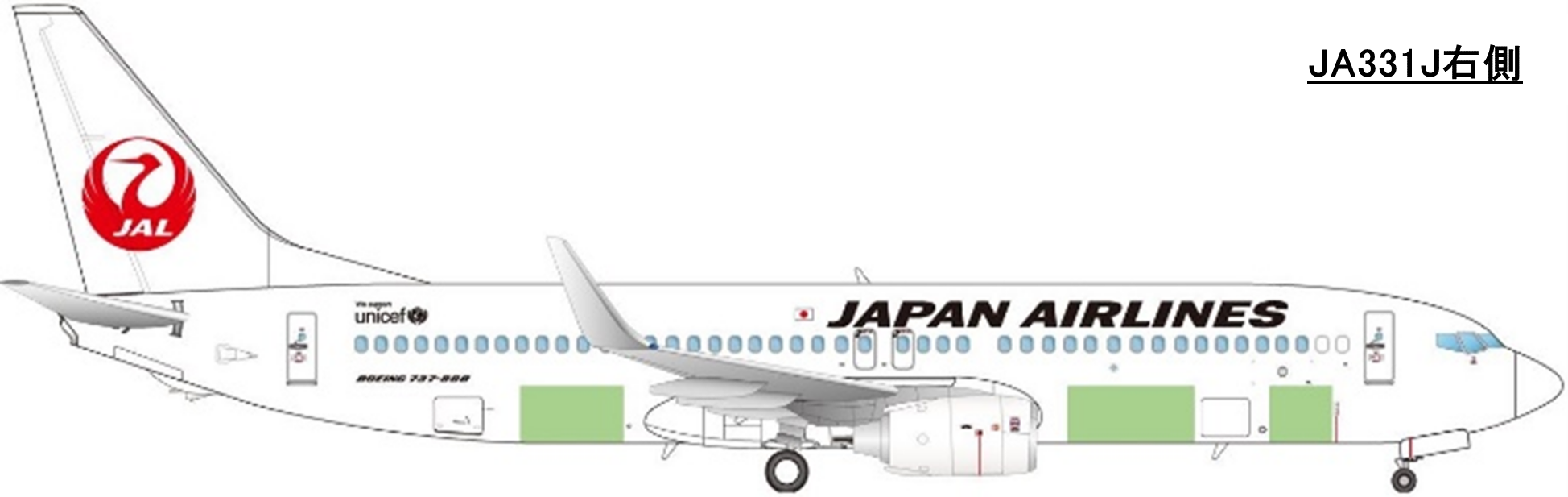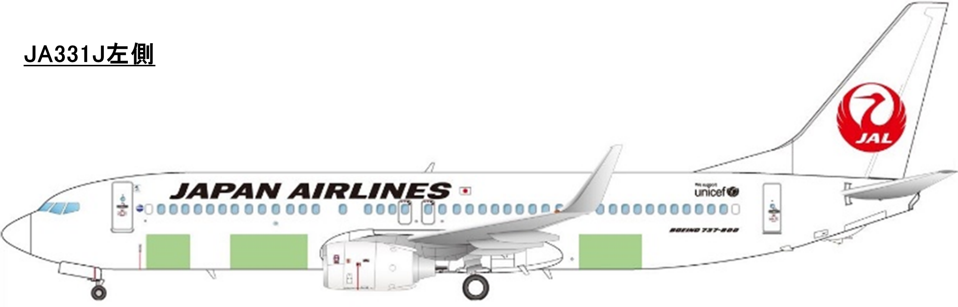 これらの工夫や検証の結果、航空機外板への大面積施工が可能と判断し、2023年11月、ボーイング737-800型機の国内線機材1機(JA331J)の胴体下部に、合計約25m2のリブレット形状を施工(下図緑部分)することに成功しました。