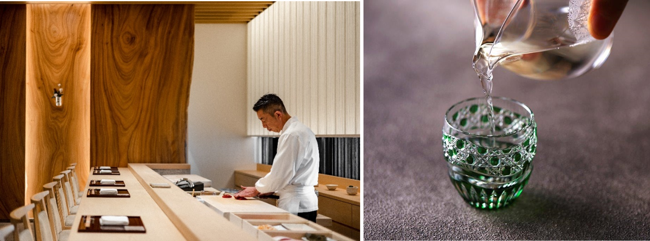 まず初めに乾杯酒として、ピノノワールで作られたふくよかな味わいが特徴のアマンオリジナルシャンパンをお楽しみください。続いて、この季節ならではの、厳選した5種類の日本酒とのペアリングをご用意いたします。檜のカウンターが美しい静謐な空間で、日本が誇る鮨の文化と匠の技、そして、武蔵 by アマンのために作られた美しい江戸切子の酒器とともに、名酒、そして、冬の旨味をご賞味ください。
