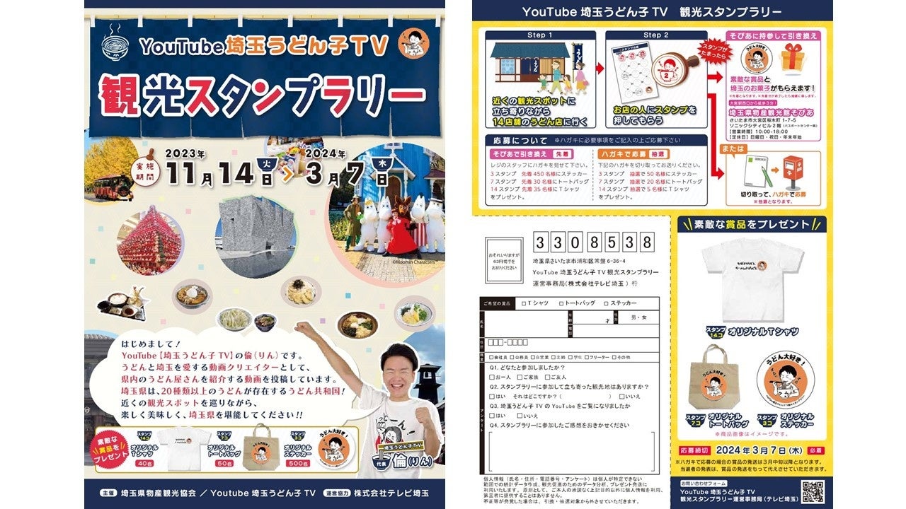 「YouTube埼玉うどん子TV観光スタンプラリー」では、埼玉のうどん屋さんを紹介する人気Youtubeチャンネル「埼玉うどん子TV」の「倫」氏がおススメするうどん店舗の中から、今回14店舗を選定。埼玉の魅力ある観光地とともに各店舗、特色のある美味しいうどんを食べていただくスタンプラリーとなっております。