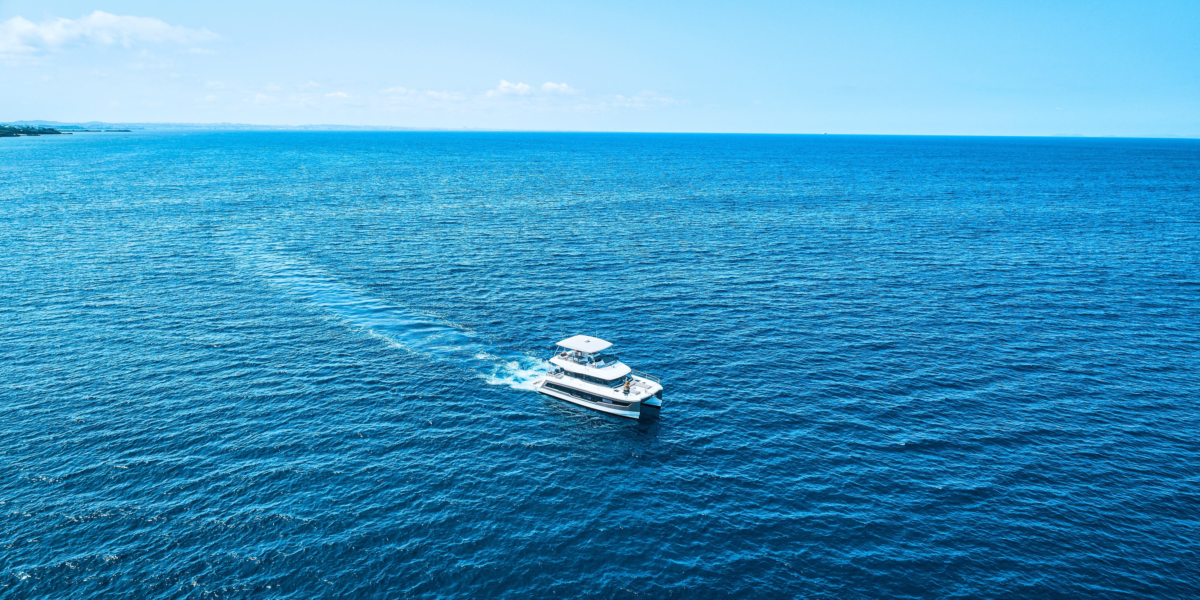 船が少ない夜明け前に、星のや沖縄近くの港からカタマランクルーザーで出航します。クジラへの負荷が少ない環境を整えるため、クジラとの適切な距離、船の速度、旋回方法、観察時間等のルールを守りながらホエールウォッチングをします。ポイントまでの移動は、大きなソファが配された広い船内でゆっくりと過ごすことができるため快適です。クジラを見つけたら、個体を識別する尾びれの写真撮影やソングと呼ばれるクジラの鳴音を録音するなど県内のザトウクジラ調査に提供するための本格的なデータ収集を行います。ゆっくりと明けていく空と時間の経過とともに青さが増していく美しい海でホエールウォッチングを満喫します。