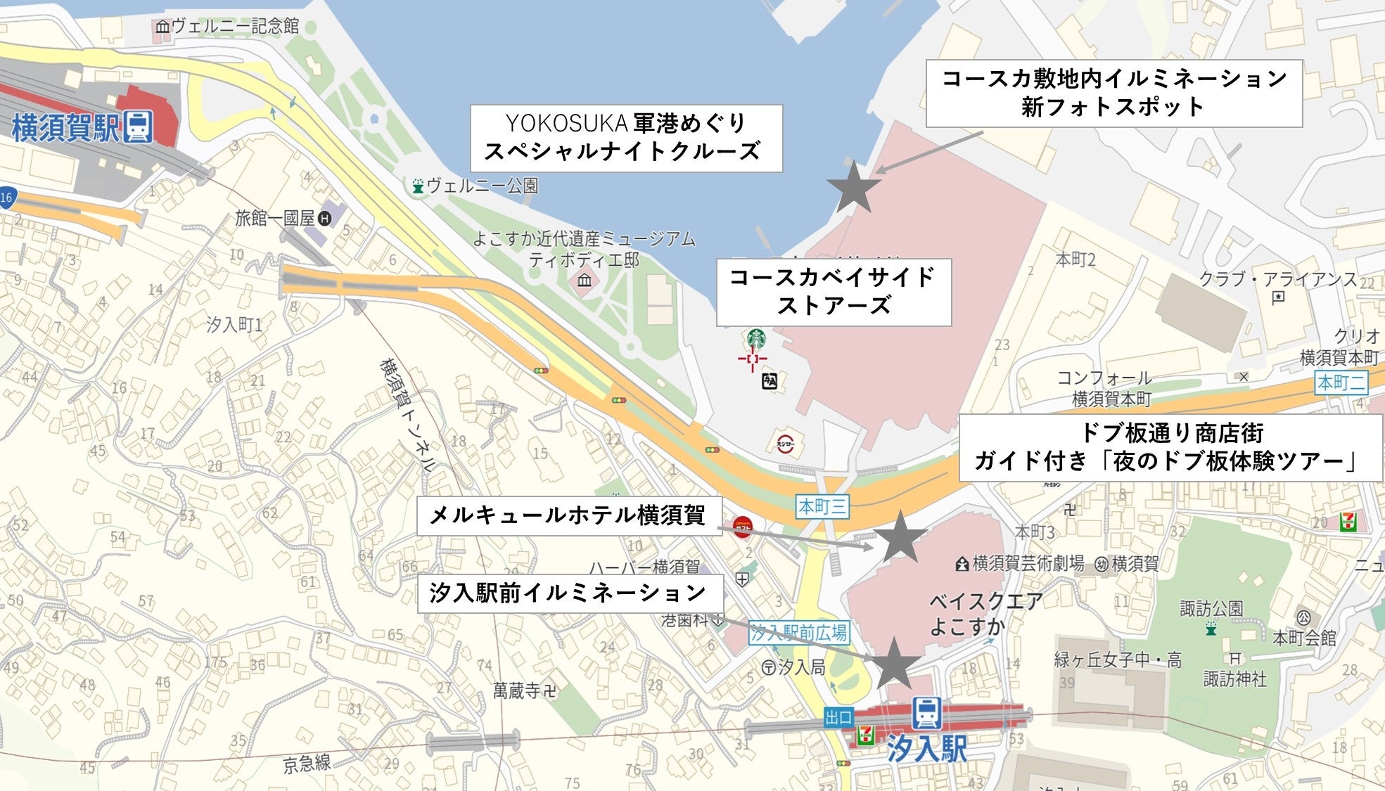 コースカが展開する「ENJOY!夜スカ! ~イルミネーション&ナイトクルーズ~」は、京浜急行本線「汐入」駅周辺を明るく照らし、活性化させることにより、そこに暮らす地域住民に加え、訪れる観光客が、夜の間も安心して楽しく過ごせる環境をつくり、「ナイトタイムエコノミー」の発展が地域の経済・観光・宿泊事業に貢献することを目的としています。横須賀市、「YOKOSUKA軍港めぐり」運航の株式会社トライアングル、ドブ板通り商店街や、メルキュールホテル横須賀との連携・協力も決定しており、コースカが地域連携で取り組む本事業に、どうぞご期待ください。