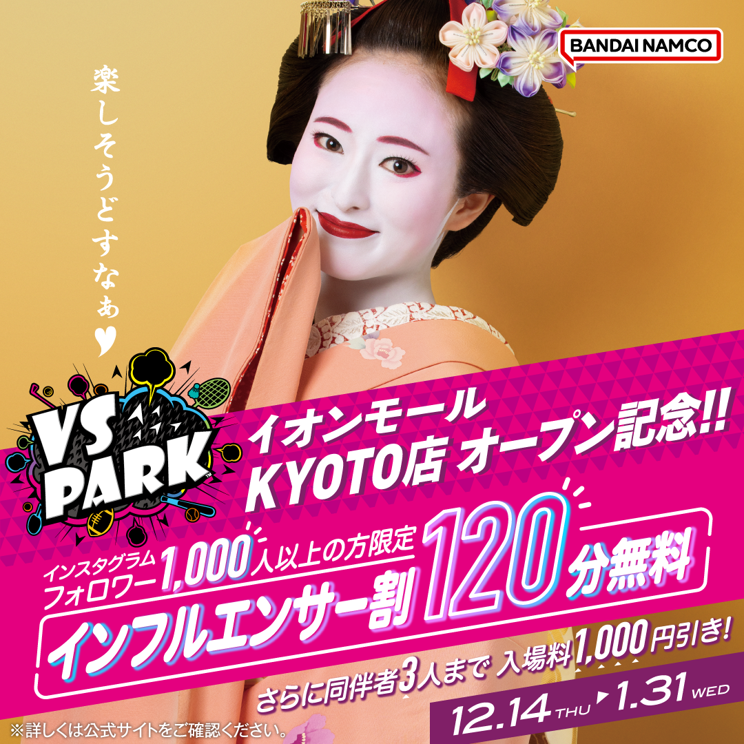 京都駅・四条駅・烏丸線車両内で見つけよう!交通広告「○○の舞妓さん」キャンペーン 概要 [期間広告掲出期間:12月11日(月)~1月7日(日) キャンペーン期間:12月14日(木)~1月8日(月) [内容]12月11日(月)~1月7日(日)の期間中、京都駅・四条駅にてVS PARK イオンモールKYOTO店の広告を掲出!ここに表示する「○○の舞妓さん」の合言葉を受付で伝えるか、広告の写真を見せると、120分1,000円でVS PARKを楽しめます! ■使用方法 受付にて、交通広告で見た合言葉「○○の舞妓さん」を伝えるか、広告の写真を提示してください。 ■注意事項 ※本キャンペーンは120分料金のみ対象です。 ※延長料金・絶叫体験エリアは適用外です。 ※他サービス・割引との併用はできません。 ※本キャンペーンの払い戻し(換金)はできません。 ※詳しくはニュースサイトをご確認ください。 [ニュースサイト]https://bandainamco-am.co.jp/game_center/loc/vspark-kyoto/NEWS/20231211_maiko.html |