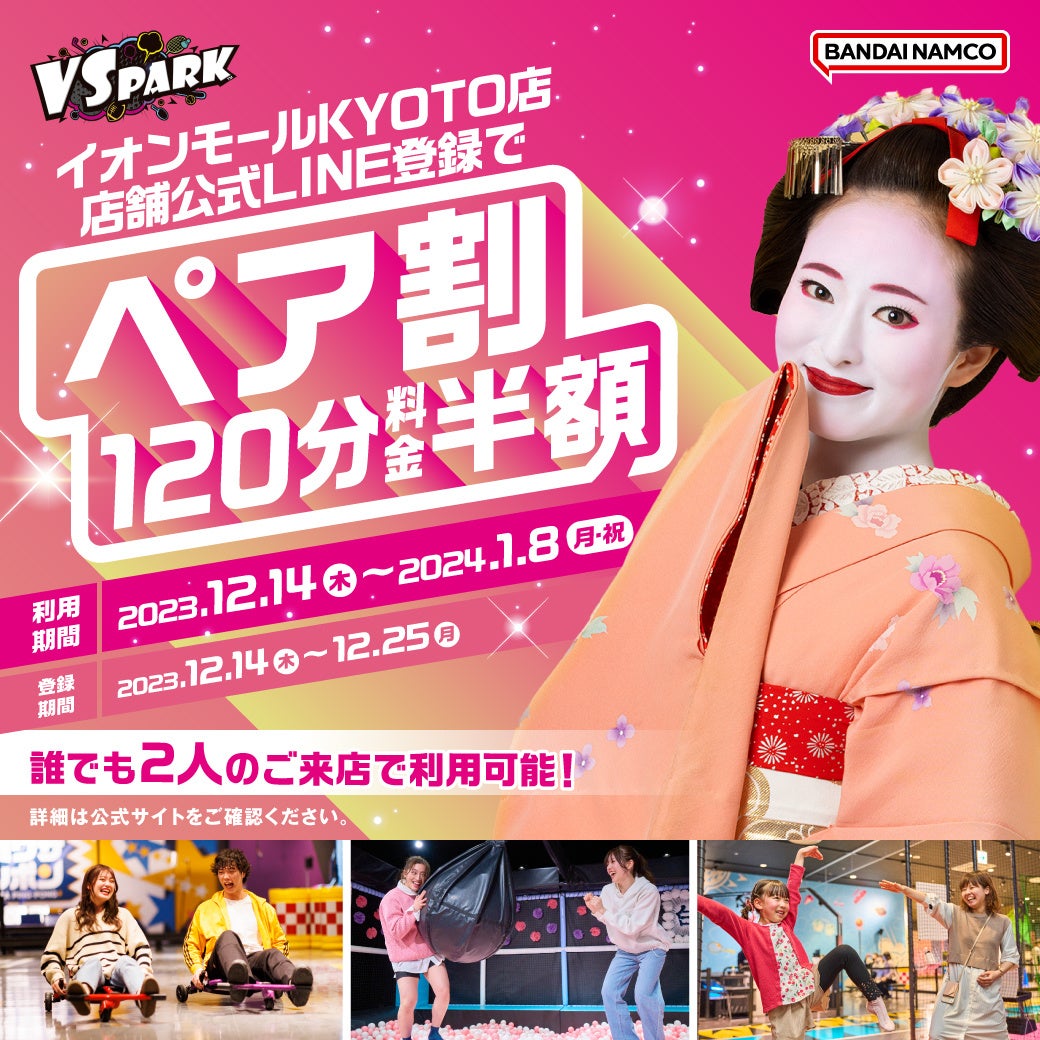 2人以上の来店でお得!「ペア割」 概要 [期間]LINE友だち登録期間:12月14日(木)~12月25日(月) クーポン使用可能期間:12月14日(木)~1月8日(月) [内容]12月14日(木)~12月25日(月)の期間中、店舗公式LINEを友だち登録してくれた方に、12月14日(木)~1月8日(月)のあいだ、2人以上の来店で2人とも120分料金が半額になるクーポンをプレゼント! ■使用方法 受付にてLINEクーポン画面を提示してください。 ■注意事項 ※本キャンペーンのご利用にはLINE友だち登録が必要です。 ※本キャンペーンは120分料金のみ対象です。 ※延長料金・絶叫体験エリアは適用外です。 ※他サービス・割引との併用はできません。 ※本キャンペーンの払い戻し(換金)はできません。 ※詳しくはニュースサイトをご確認ください。 [ニュースサイト]https://bandainamco-am.co.jp/game_center/loc/vspark-kyoto/NEWS/20231113_pair.html |