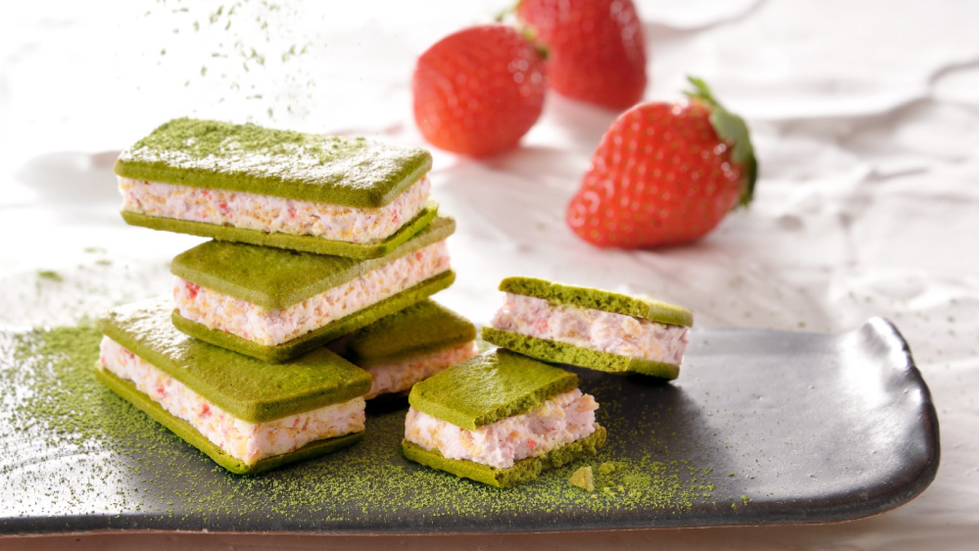 抹茶クッキーでいちごのホワイトチョコをサンド。