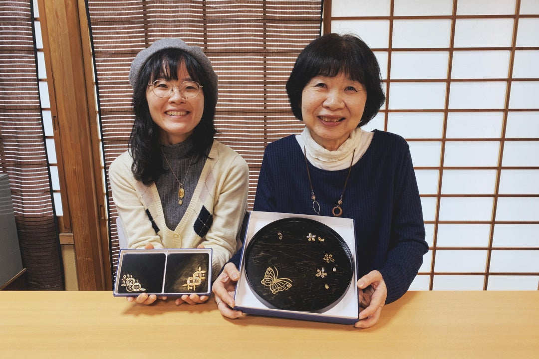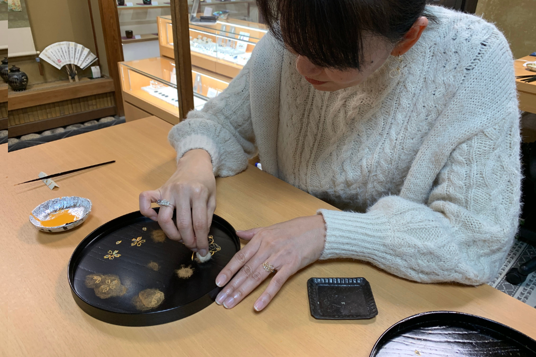 貴族の調度品にも利用された、その洗練された煌びやかさに触れる螺鈿体験です。丸盆かペアコースターの二種類から好きな方を選んでいただき、貝殻を丁寧に貼り付け、下絵に沿って塗料で絵付けするなど、「蒔絵螺鈿」の技術を、伝統工芸士から学びます。