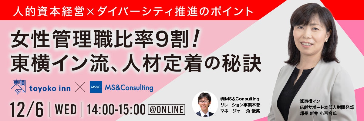 今年から始まった「人的資本開示の義務化」の中でも、とりわけ注目されているのが「女性活躍」についての項目です。そこで、女性部長比率ランキング2位※の東横イン様をゲストに迎え、「女性組織を成長させるための人材育成の取り組み」「推進の鍵となる管理職対象の研修」など、東横インの人材戦略についてお話しいただきます。他社の店舗運営を学べる貴重な機会です。ぜひご参加ください。 ※東洋経済の「CSR企業総覧」2023年版