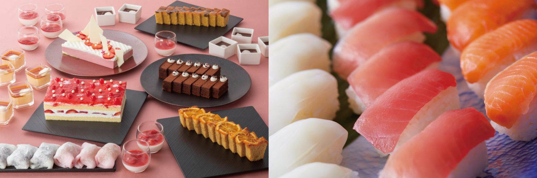 「紅白仕立てのムースケーキ」「新春紅白ショートケーキ」「ガトーショコラ」「ファゴットのパウンドケーキ」「紅白ゼリー」「たまごプリン」「焼き餅入りぜんざい」「セルフメイク フルーツ大福」「アイスクリーム」「シャーベット」「ソフトクリーム フルーツソース トッピング」「ホテルメイドパン」