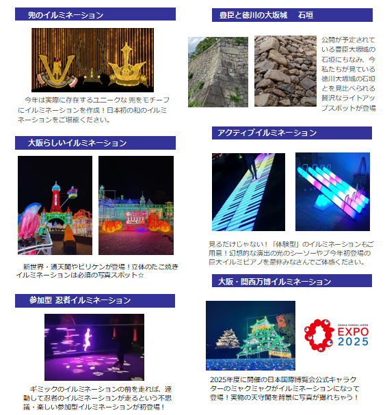 大阪城の歴史が分かるイルミネーションや、大阪の観光名所を再現したエリアなど、