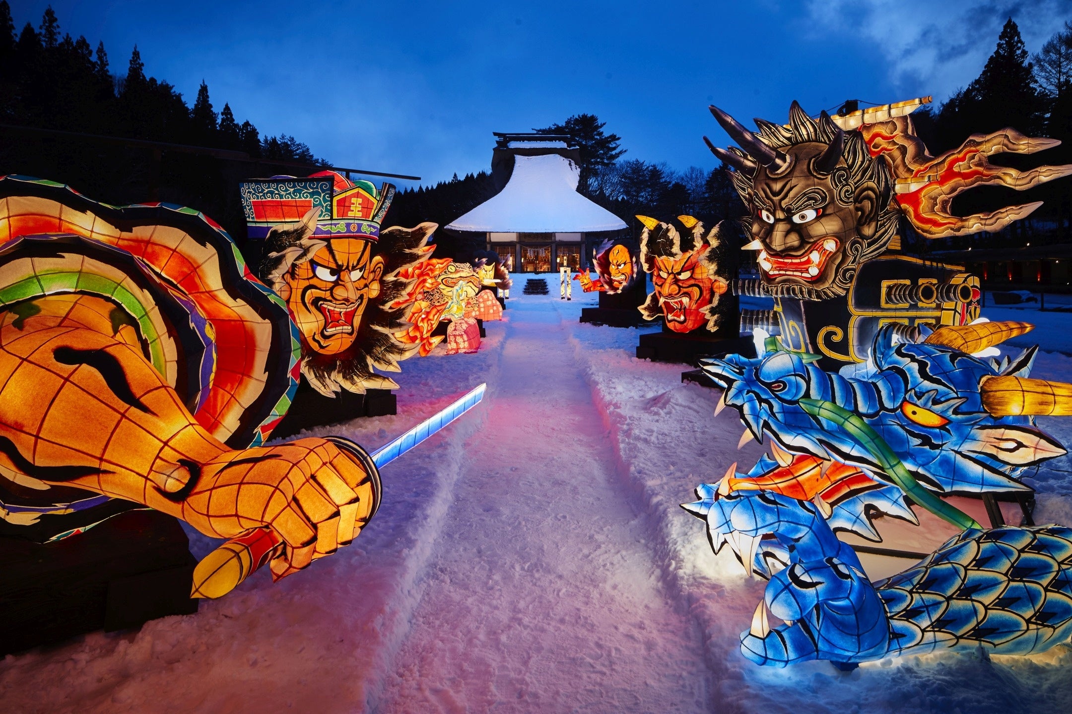 青森の冬は、雪が降り積もり、見渡す限り白銀の世界です。約22万坪の敷地を持つ青森屋も冬になると、茅葺屋根の古民家が並ぶ敷地内の公園が雪化粧をし、青森の原風景を感じられる美しい景色が広がります。また、青森の夏の風物詩である祭りも青森文化の代表格です。中でも、青森ねぶた祭の主役である人形型の山車「ねぶた」は祭りが終わったら1年かかりで制作したものが取り壊されるため、通常は夏の時期にしか見ることができないことから、冬でもねぶたを見たいという声が多く寄せられています。青森屋では、夏祭りの象徴であるねぶたと雪景色を同時に楽しんでいただけるように、2017年から本プログラムを実施してきました。今冬からは展示するねぶたを一新し、干支をテーマにした6体のねぶたで青森の冬を色鮮やかに彩ります。
