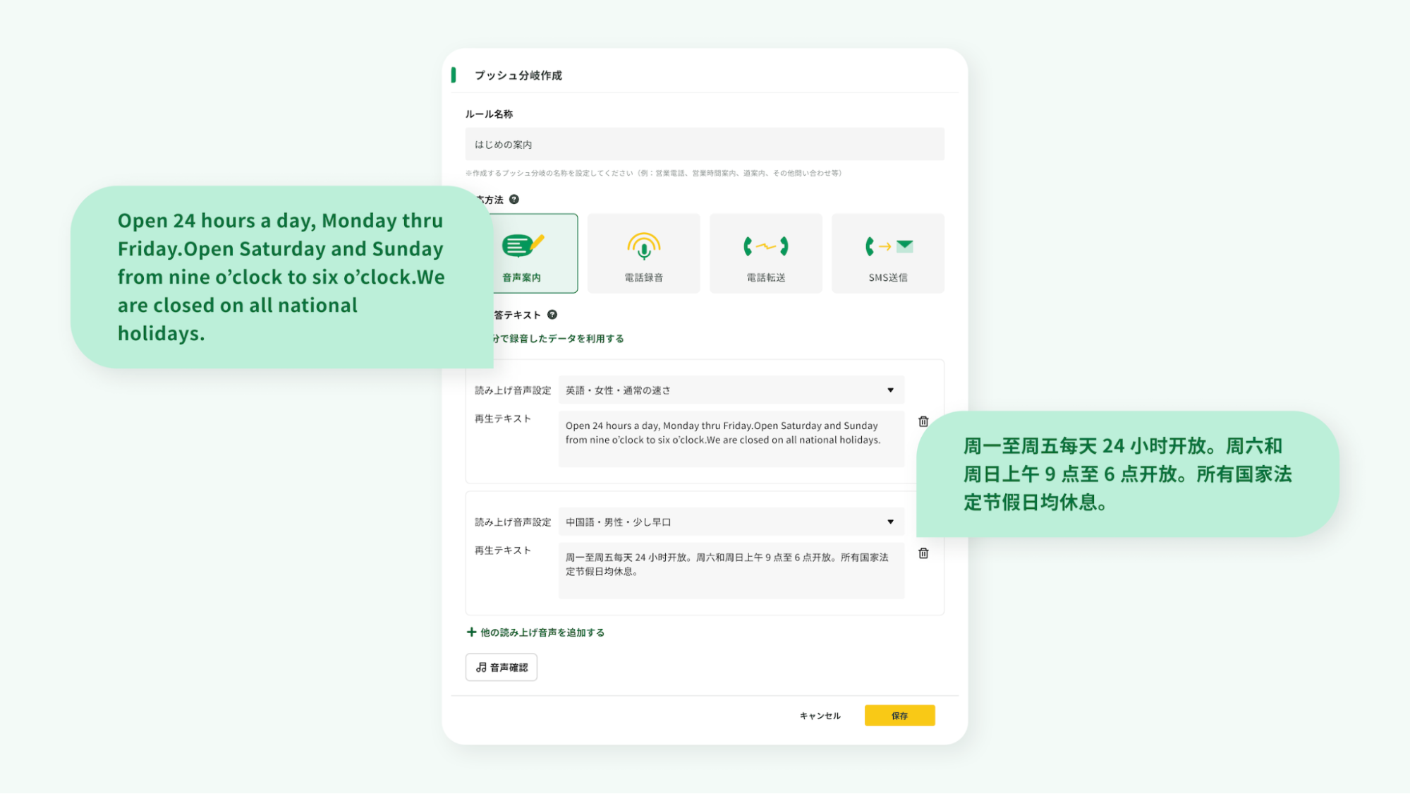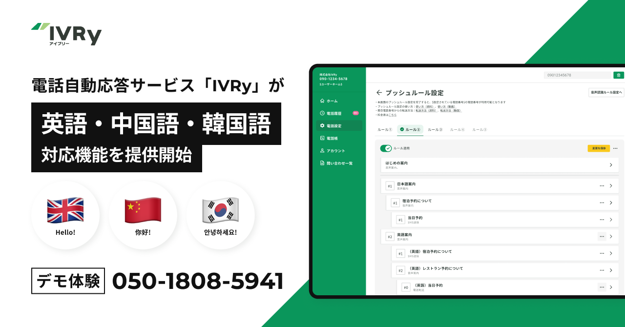 ・電話自動応答サービス「IVRy」(英語版・中国語版・韓国語版)デモ電話