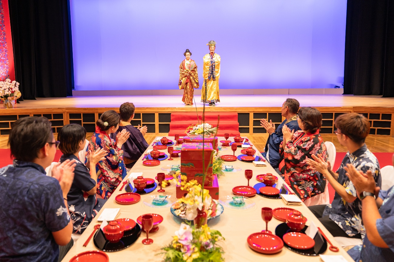 結婚式は玉座を配置し、琉球王朝をイメージした設えを「シャボン玉石けん くくる糸満 大ホール」にご準備いたします。琉球王国の王子と王妃に扮した2人が、参列者の前で永久の愛を誓う人前式の琉球宮廷婚から守礼の宴まで、すべて専任のコーディネーターが付き、きめ細かなサポートをします。参列者の方もご希望により琉球衣装を着てご参加いただけます。