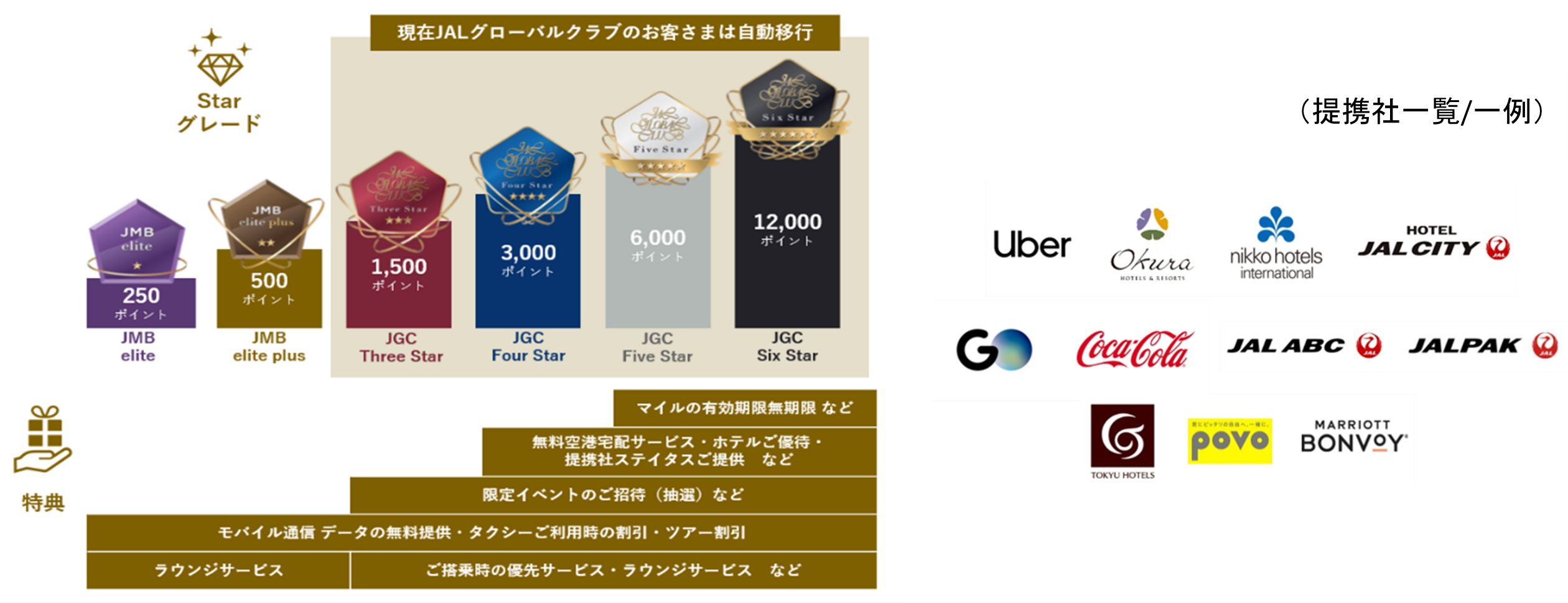 JALは、日常生活のさまざまなシーンでマイルをためて、非日常の特別な体験でマイルをつかう「JALマイルライフ」を推進しています。その一環として、これまでの航空機搭乗に加えて、日常生活のさまざまなサービスのご利用でたまる生涯実績ポイントにより新たなステイタスや特典をご提供する「JAL Life Status プログラム」を、2024年1月から開始し、JALグローバルクラブのご入会資格や新設する6つのStar グレードごとにより充実した特典をご用意します。なお、1年間のご搭乗実績に応じてステイタスや特典をご提供するFLY ONプログラムに変更はございません。