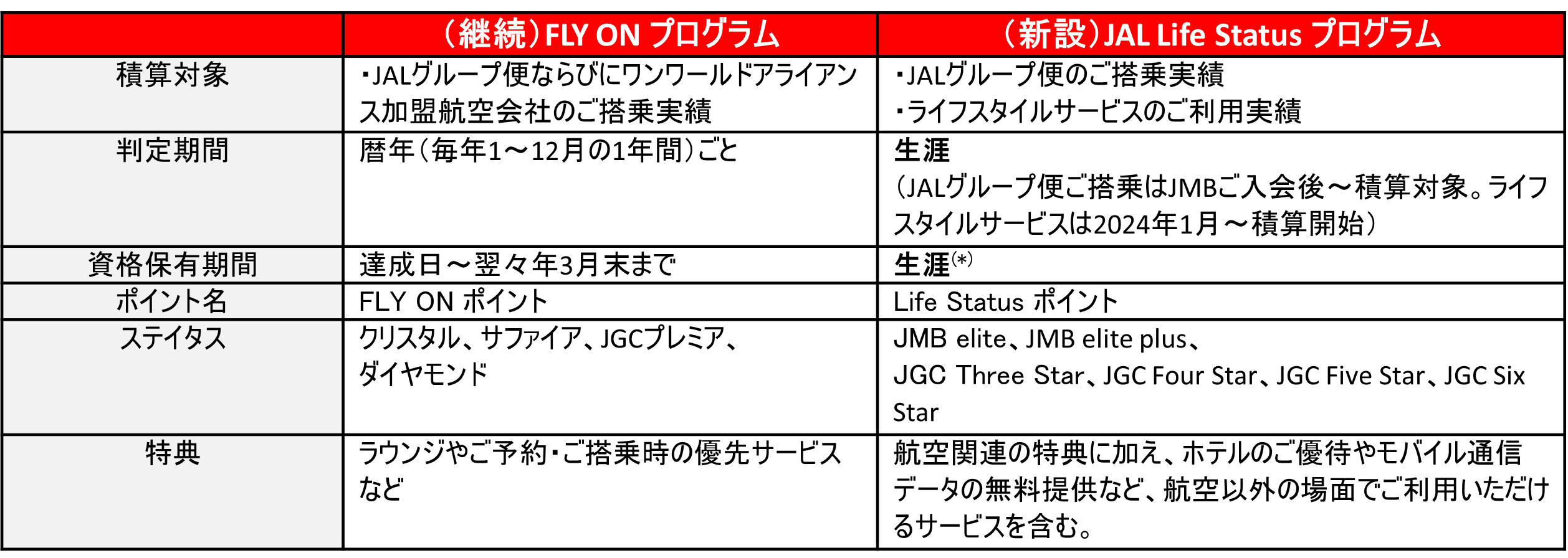 【これまでのFLY ON プログラムと今回新設するJAL Life Status プログラムの違い】
