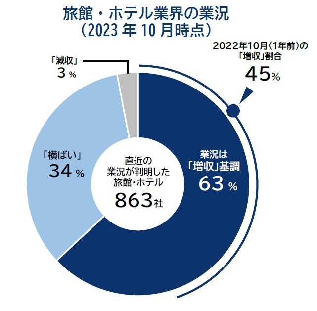 旅館・ホテル業界が急回復の局面を迎えている。過去1年間に帝国データバンクが調査した全国の旅館・ホテル業者のうち、直近の業況が判明した863社を集計した結果、63%の企業が「増収」基調であることが分かった。「全国旅行支援」による国内観光の再始動に加え、水際対策の緩和により訪日外国人観光客の受け入れが再開した1年前の22年10月(45%)の水準を大きく上回り、コロナ禍以降で最高を更新した。「前期並み(横ばい)」は34%、「減収」割合は3%と、それぞれ「増収」の割合を大きく下回った。