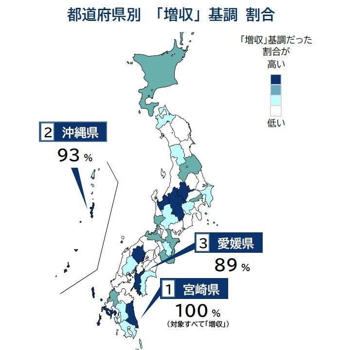 都道府県別にみると、「増収」基調となったホテル・旅館の割合が最も高かったのは「宮崎県」で、対象となった企業すべてが増収と回答した。「沖縄県」も9割超で増収となったほか、愛媛県や群馬県、長野県、長崎県など6県では増収が8割を超えた。