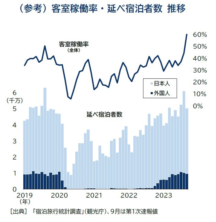 日本政府観光局(JNTO)によれば、2023年9月の訪日客数は218万4300人となり、コロナ前の19年同月比で96.1%の水準に達するなど、コロナ禍前の水準まで概ね回復した。旅館・ホテルなど客室稼働率も6割に迫るなど、コロナ前の水準を上回る月もあり、コロナ禍で抑制された宿泊・訪日需要の反動増もみられる。