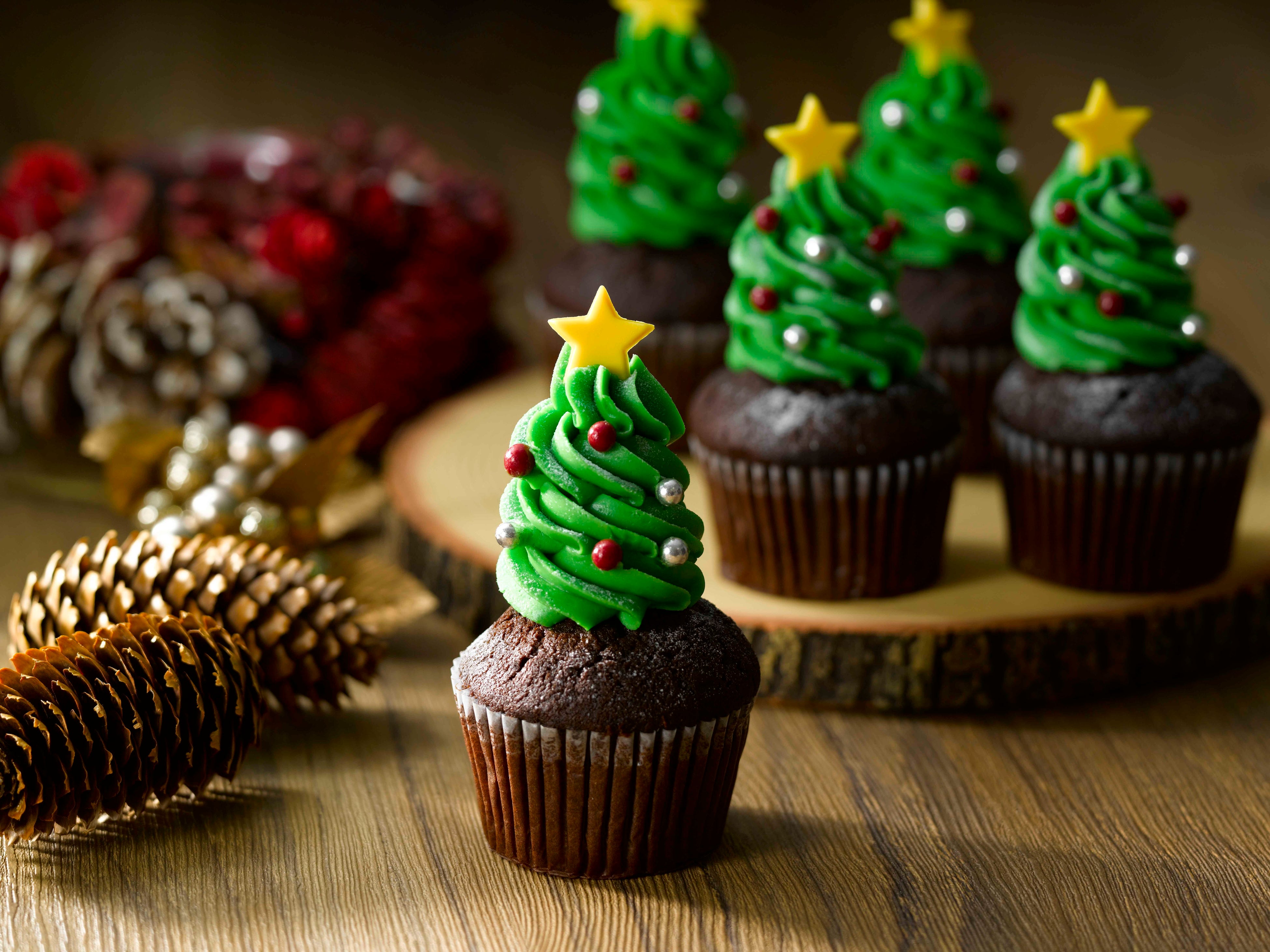 ラズベリーソースの入ったココアカップケーキにピスタチオクリームのクリスマスツリーをデコレーションした色鮮やかなデザート