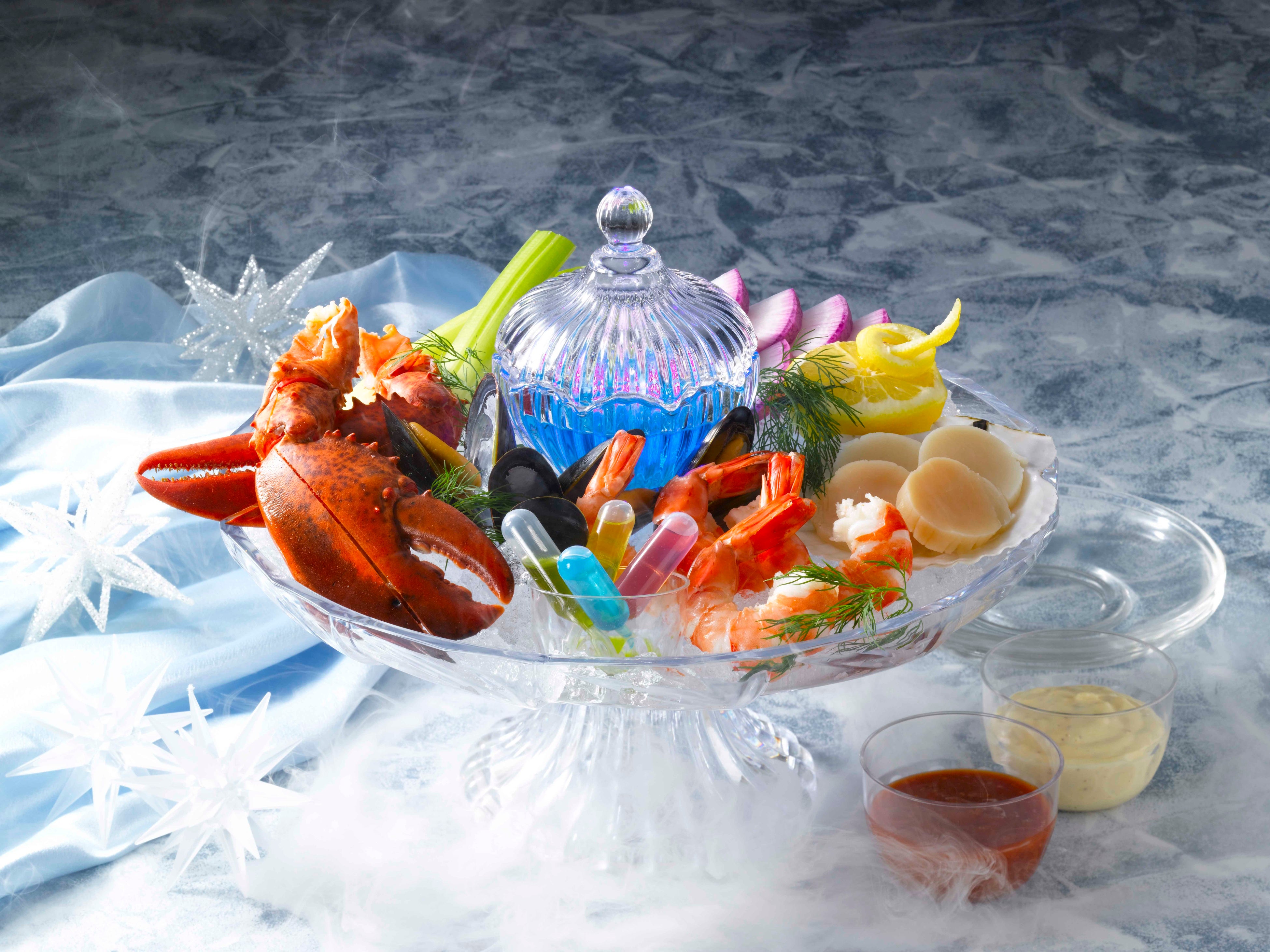 ユールボールの豪華なシーフードディナーをイメージしたシーフードプラッター。新鮮な魚介類を2種類のカクテルソースと、4色のシーズニングでお楽しみください。