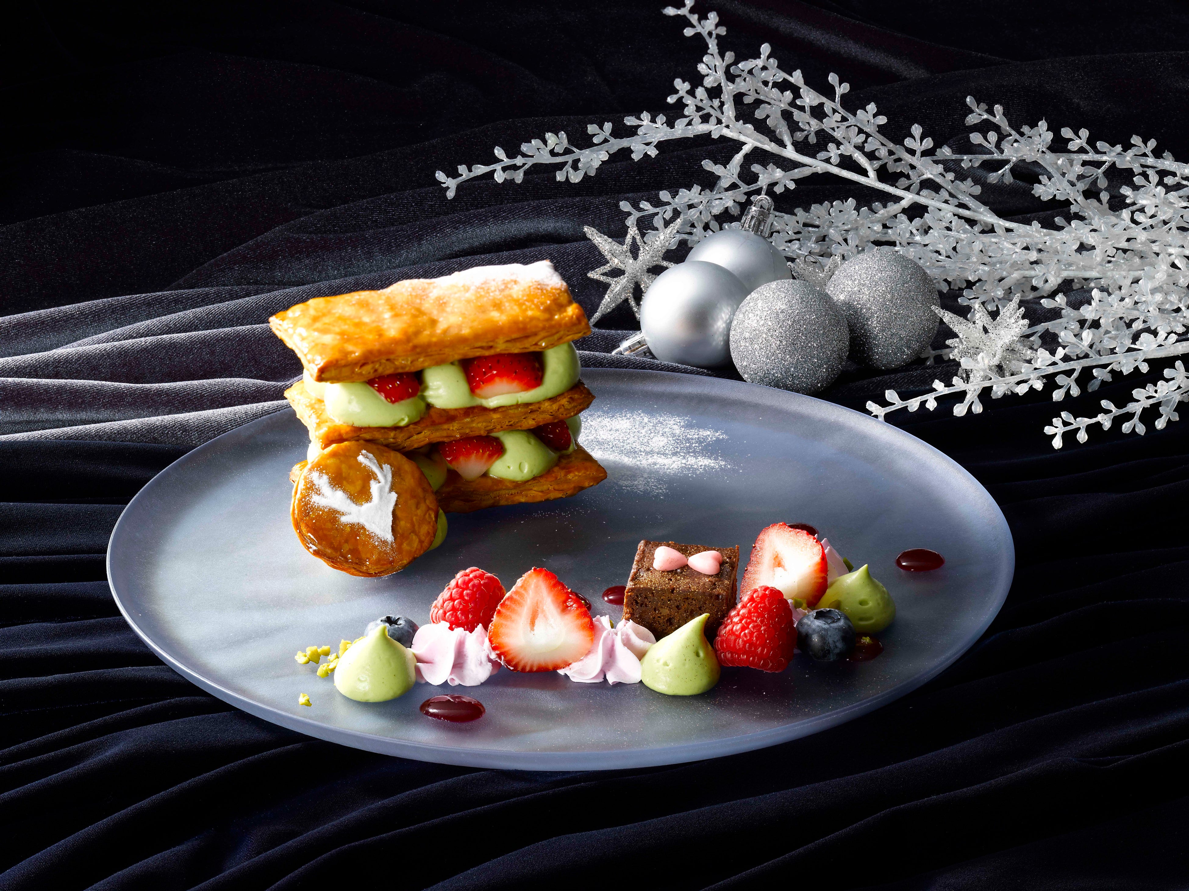 パトローナスのビスケットを添えた、イチゴとピスタチオクリームのミルフィーユ。 甘酸っぱい苺と香り高いピスタチオクリームのコンビネーションをお楽しみください