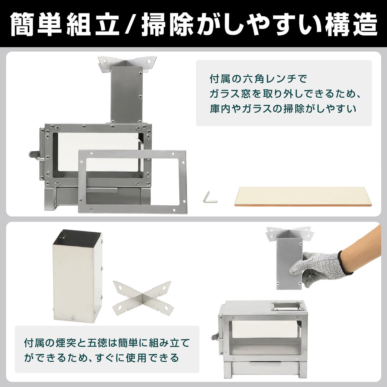 本体、煙突、五徳(上)、五徳(下)、六角レンチ(2.5mm)、収納袋 |