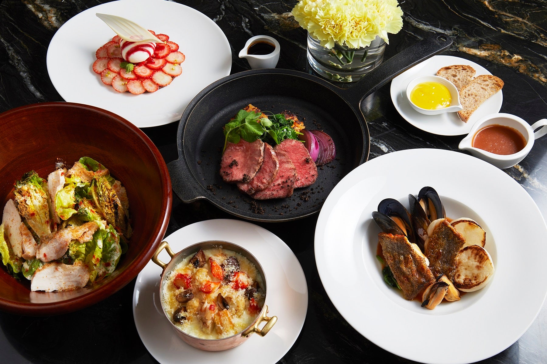 一年を締めくくる大晦日の夜は、The Blue Roomで記憶に残る今年最後の晩餐を。コースには、青森県産地鶏の燻製、北海道タラバガニグラタン、クエのソテー、いわて短角牛フィレのローストとストロベリータルトをご用意しました。東京を象徴するアイコニックな夜景と美食が、一年の思い出を振り返る大切な夜を彩ります。