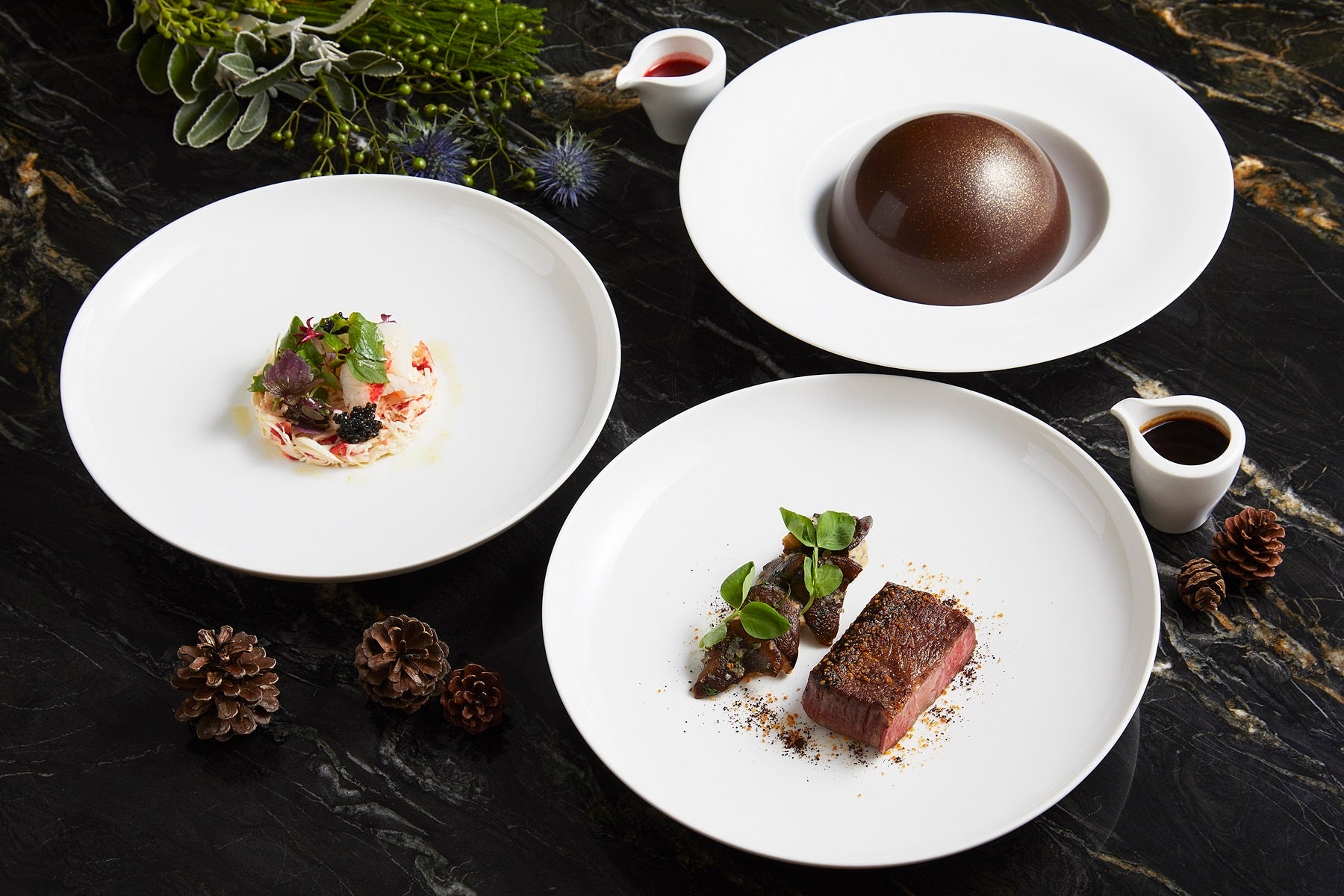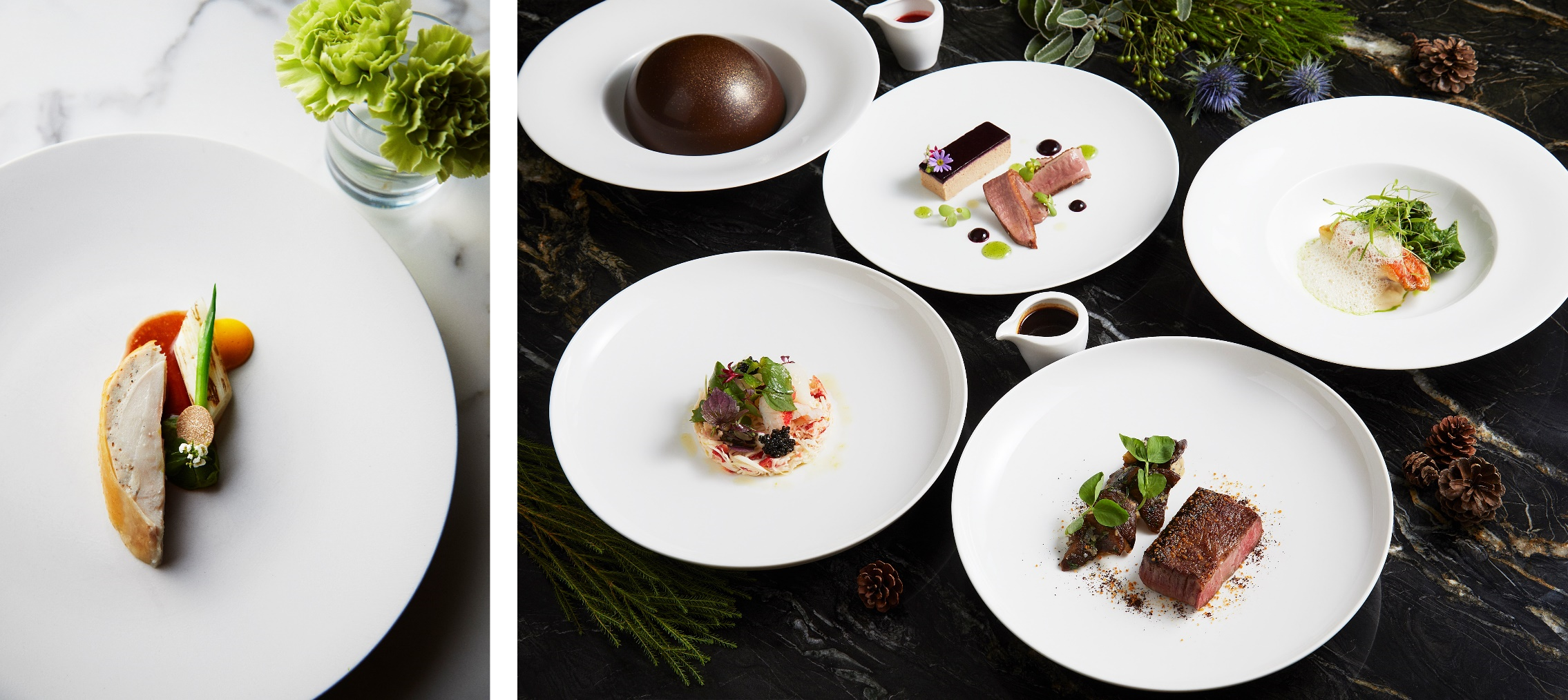 ミシュランスターシェフのトム・エイキンズが指揮を執るThe Jade Room + Garden Terraceでは、2023年12月13日(水)から鹿や甘鯛など冬の食材を主役にしたフェスティブコースを、12月22日(金)のディナーから12月24日(日)まで、この時期にしか出逢えない松茸や白トリュフ、最高級シャポンなど希少な食材を使ったクリスマスイヴとニューイヤーイヴのコースをご提供します。繊細かつ華やかな料理の数々をソムリエ厳選のワインペアリングと共にご堪能ください。