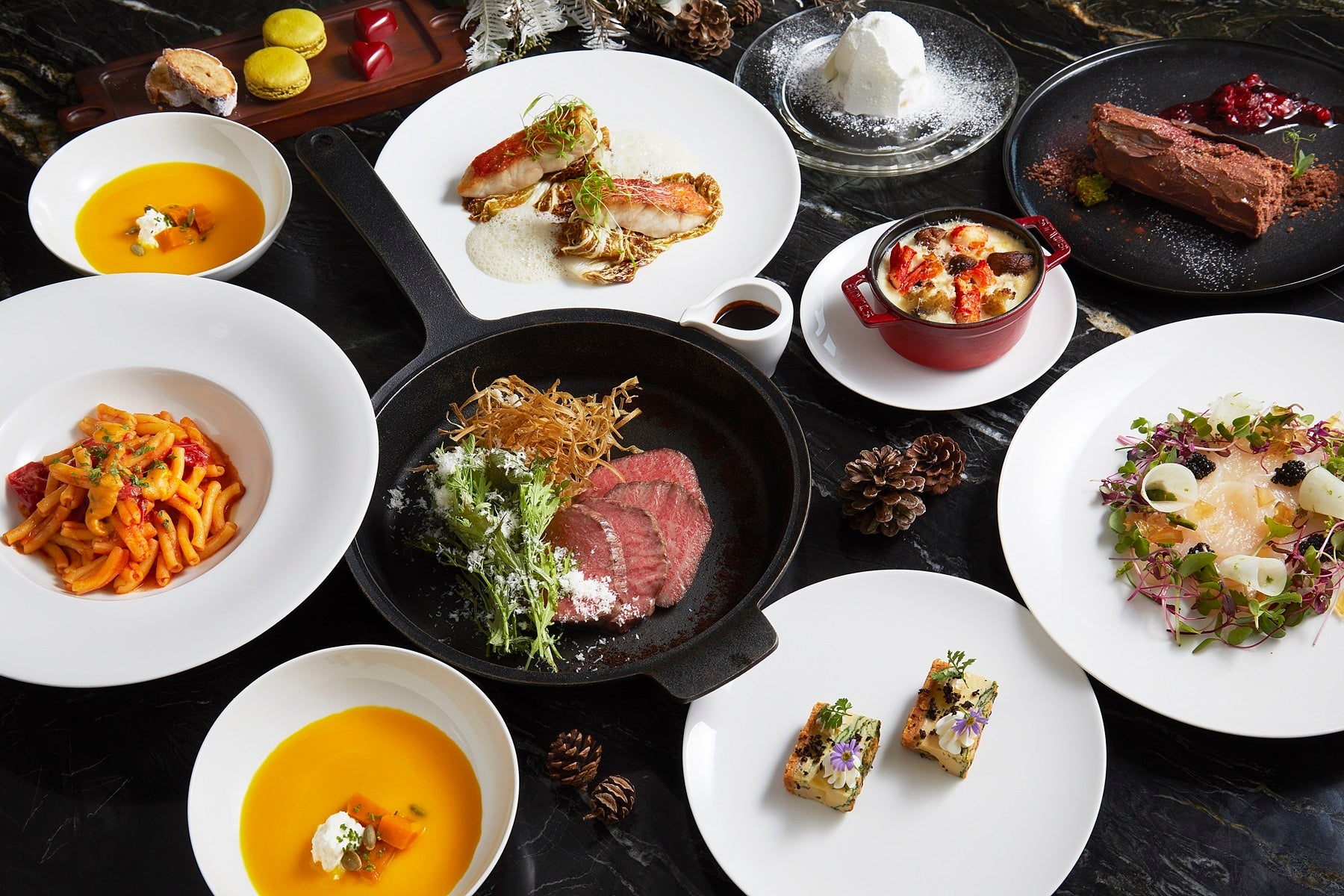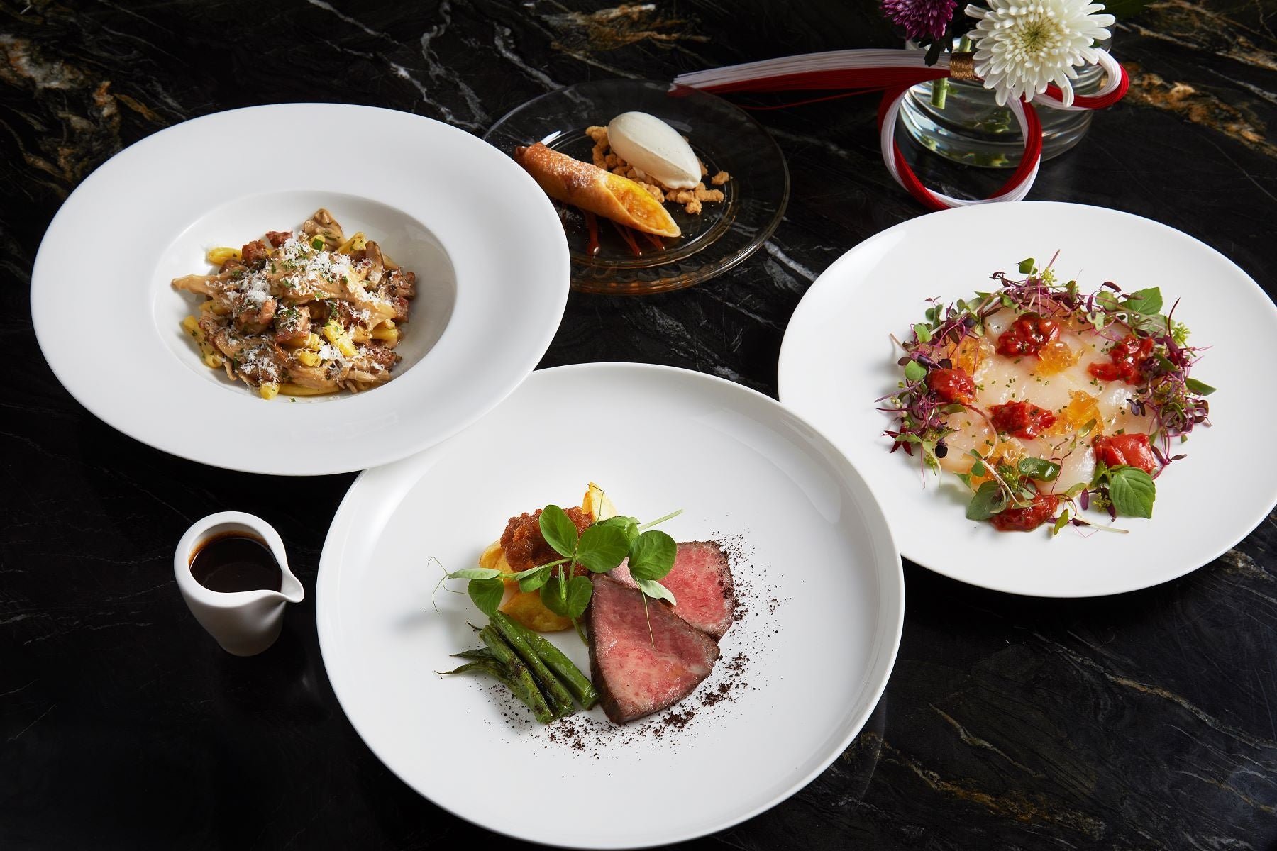新年の幕開けを祝う季節の料理は、帆立貝のクルード、茸とサルシッチャのカサレッチェ、和牛内もものロースト、そしてデザートが付いた4品のコース、または上記の料理を含む、前菜4種、メインディッシュ3種、 デザート3種の10品を愉しめるシェアリングスタイルのコースをご用意しています。