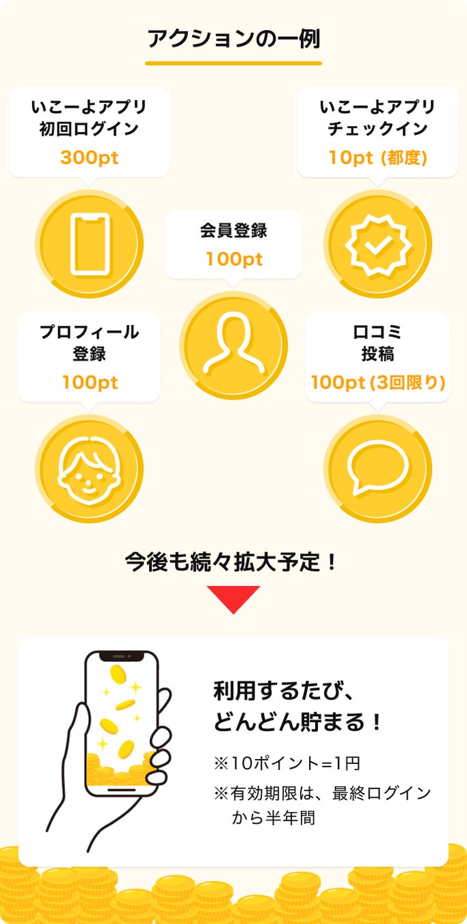 ・「いこーよ」への会員登録や、「いこーよアプリ」への初めてのログイン、初めての写真口コミ投稿(写真付きのもの)などのアクションに伴って「いこーよポイント」を付与。