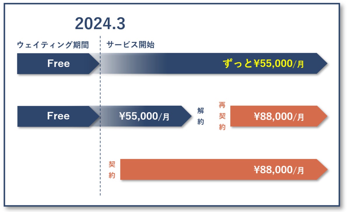 サービス開始前にウェイティング登録いただいた場合のみ、通常月額会費88,000円(税込)のところ、特別月額会費55,000円(税込)の特別料金となります。