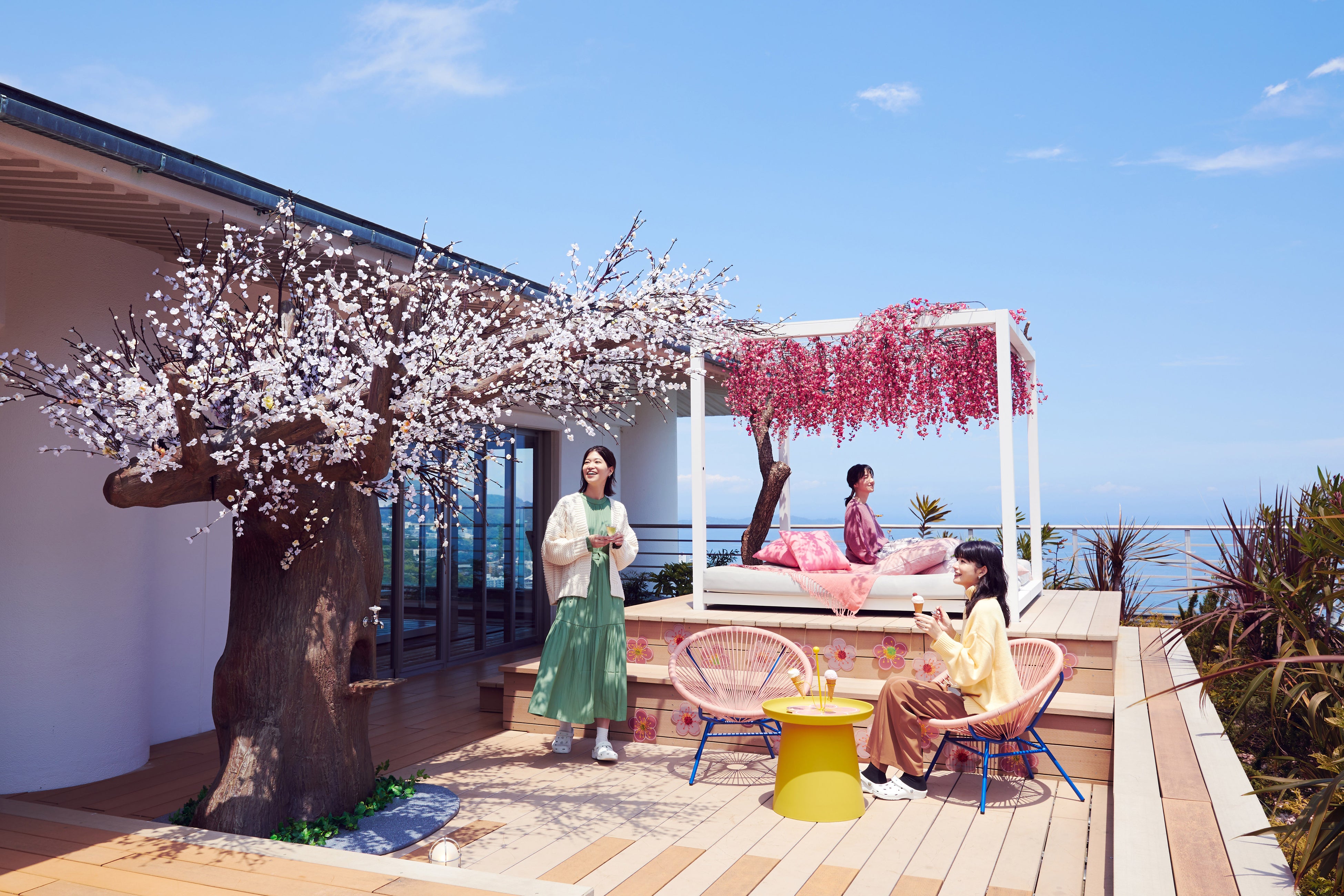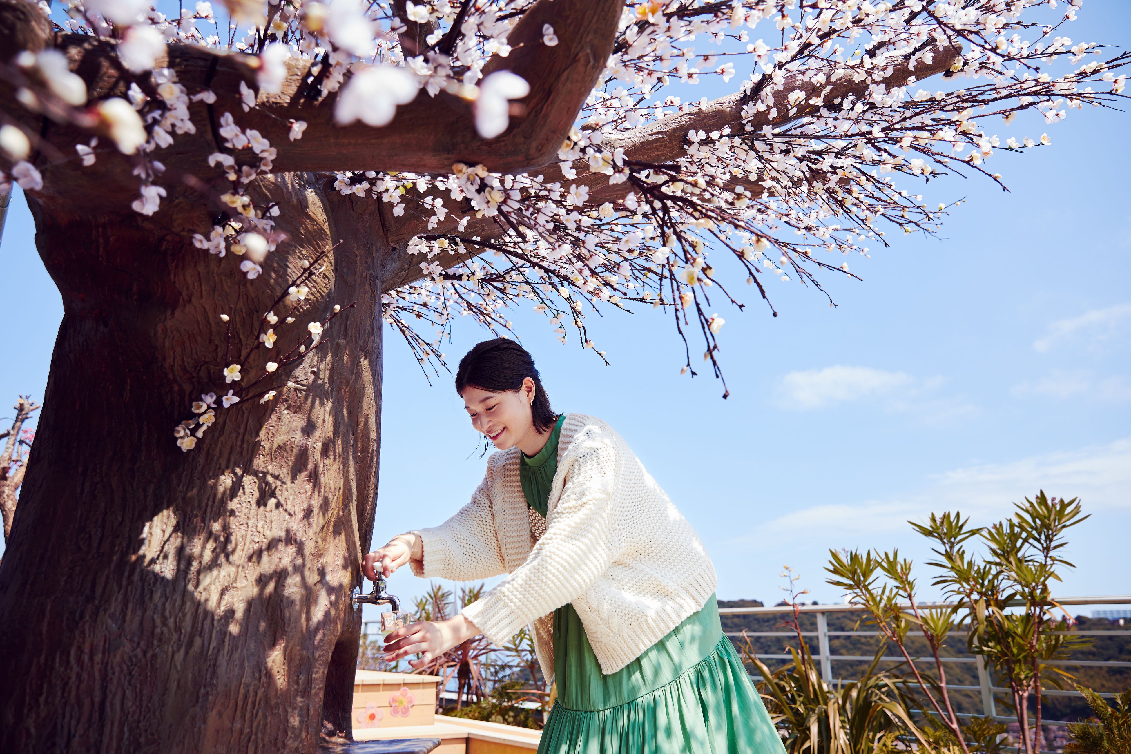 早咲き品種で白梅の代表格である「冬至梅(トウジバイ)」をイメージした「梅酢ドリンクの出る木」がテラスに登場します。高さ3メートルの梅の木の蛇口から出てくる梅酢ドリンクは、梅干しを作る際に抽出される梅酢、はちみつを使った爽やかな香りや、口の中に広がる清涼感が特徴です。一足早い春の訪れにぴったりな梅酢ドリンクを飲みながら、眼下に広がる海の青色と白梅色のコントラストを楽しめます。