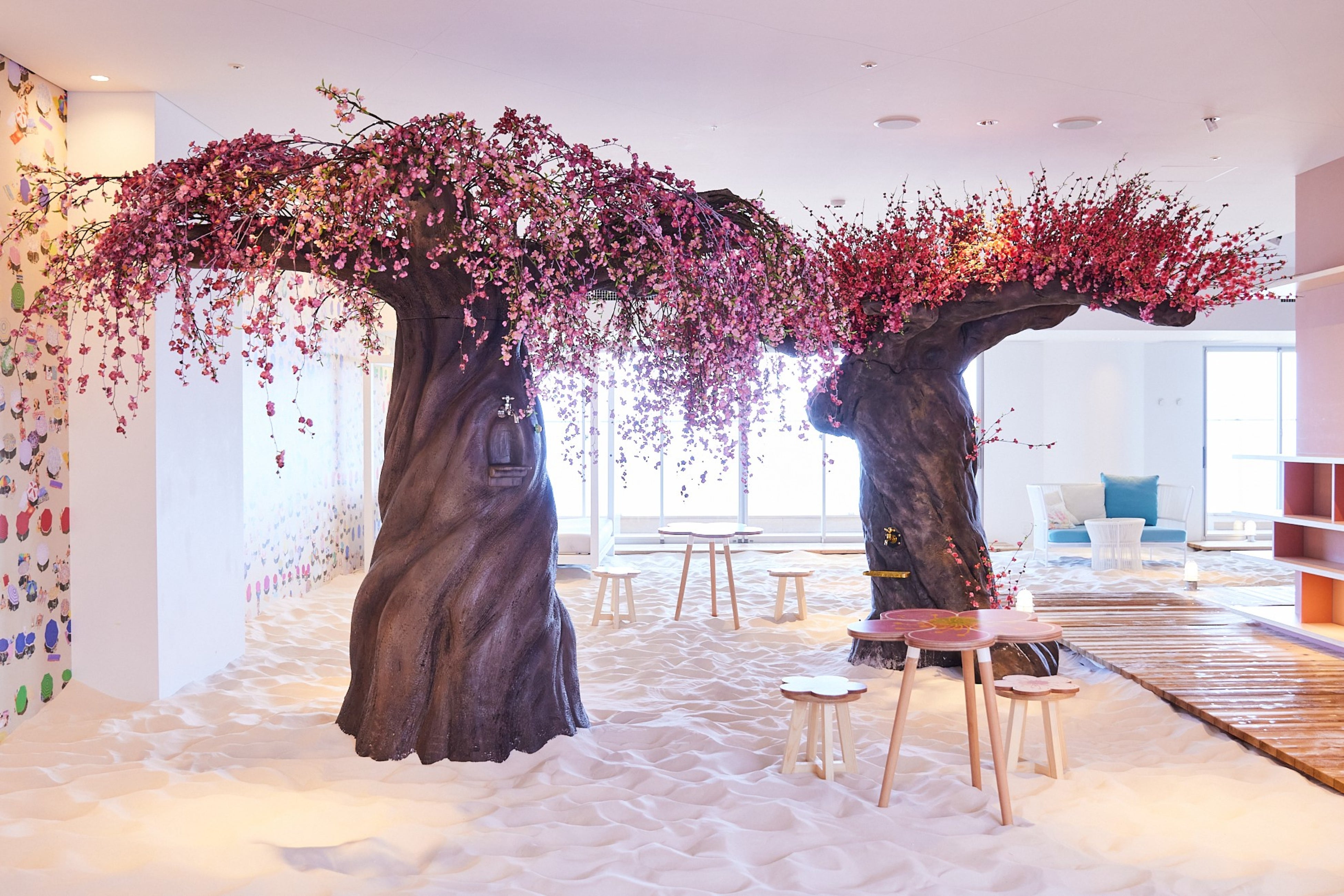 店内には、梅の花の形や色味を活かしたテーブルやいす、カフェの入口には、2本の梅の木の装飾を設えます。それぞれの木の幹には蛇口が付いており、1本目は濃い紅梅色の花が特徴的な「八重寒紅(やえかんこう)」をイメージした「梅ジュースの出る木」、2本目は、枝が広がり垂れているのが特徴的な「呉服枝垂(くれはしだれ)」をイメージした「梅酒の出る木」です。梅に囲まれた華やかな空間で、ドリンクを飲んだり読書をしたりしながら、大人から子どもまで思い思いのひとときを過ごせます。