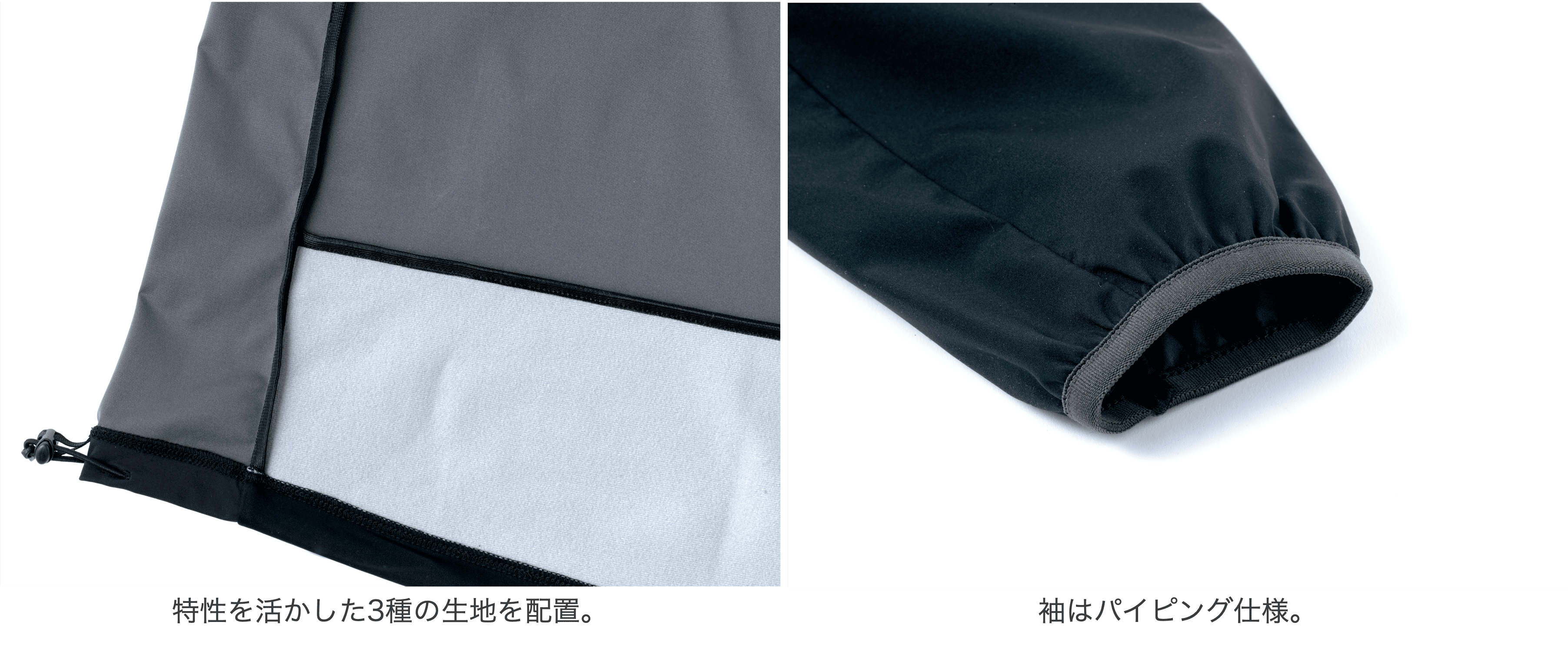 不要なものを削ぎ落としたシンプルなデザインで、防水透湿素材、ポーラテック新パワーシールドを3種類マッピングし、ヌケ感を活かすためにシームテープ非処理のジャケットに仕上げました。前身ごろと腰下は裏起毛、背中と袖、両サイドはヌケがいい薄手、脇の下は伸縮性重視の3種類のパワーシールドを使用。ストレッチの効いた防水透湿生地をシームテープ処理せず仕上げた、一年をとおして使い勝手のいいジャケットになっています。