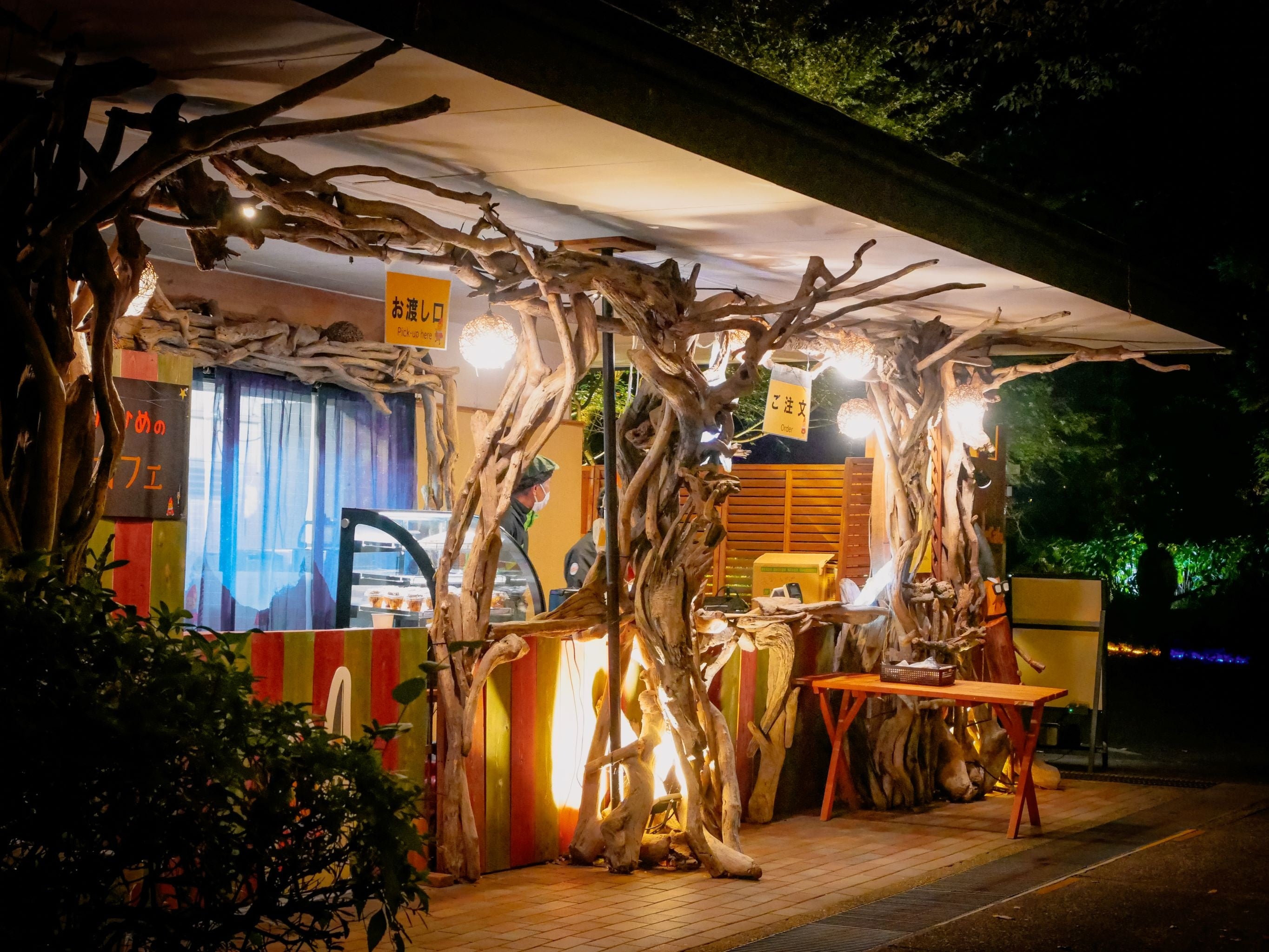 寒くなってきたら、カエデ園入口の「メイプルひめの星のカフェ」のメイプルコーヒーでほっと一息つきながら、イルミネーションを眺めるのも一興。