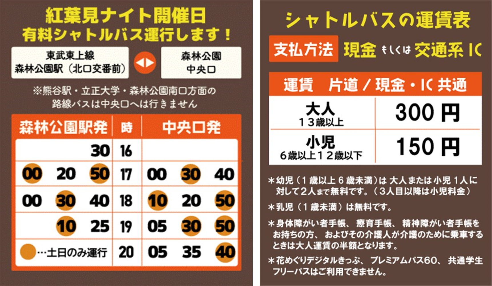 「紅葉見ナイト」開催期間中は、東武東上線「森林公園」駅と、開催会場の中央口を結ぶ、夜間シャトルバスを運行します。公共の交通機関はございませんので、ぜひご利用ください。