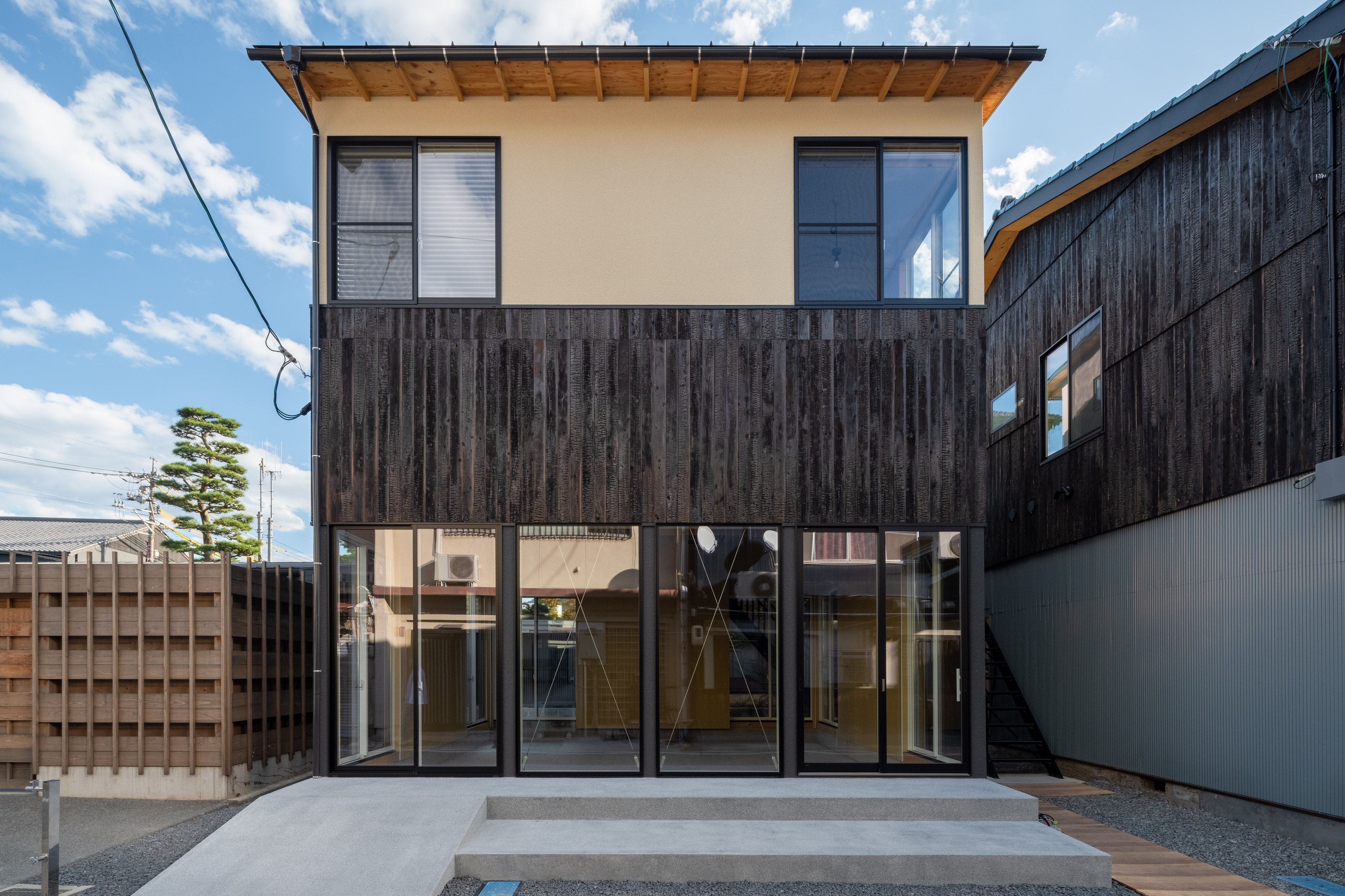 「前回のリノベーションモデルと同時に計画を進めていた新築ショップハウスのプロトタイプが遂に立ち上がった。この新築モデルはリノベーションモデルと同様に、グラウンドレベルは街に開く商店、2階を宿泊施設という構成である。建築的には正方形モジュール(6.34m×6.34mの計40㎡)を縦に積み上げたシンプルな形状を取る事で本敷地のみならず、商店街の空き地をにそのまま、もしくはマイナーチェンジで建築が可能となるように計画している。今回のプロトタイプモデルでは、1階のテナント区画は平面上4つのコーナーと接道面に開口を設け、どのようなテナントが入っても、中と外がシームレスにつながる計画としている。2階は18㎡の客室を2部屋設け、リノベーションモデルと同様に室内に高低差をつくり出しコンパクトでありつつも『すごす』と『ねる』を使い分ける事のできるミニマルな宿泊空間を目指した。」