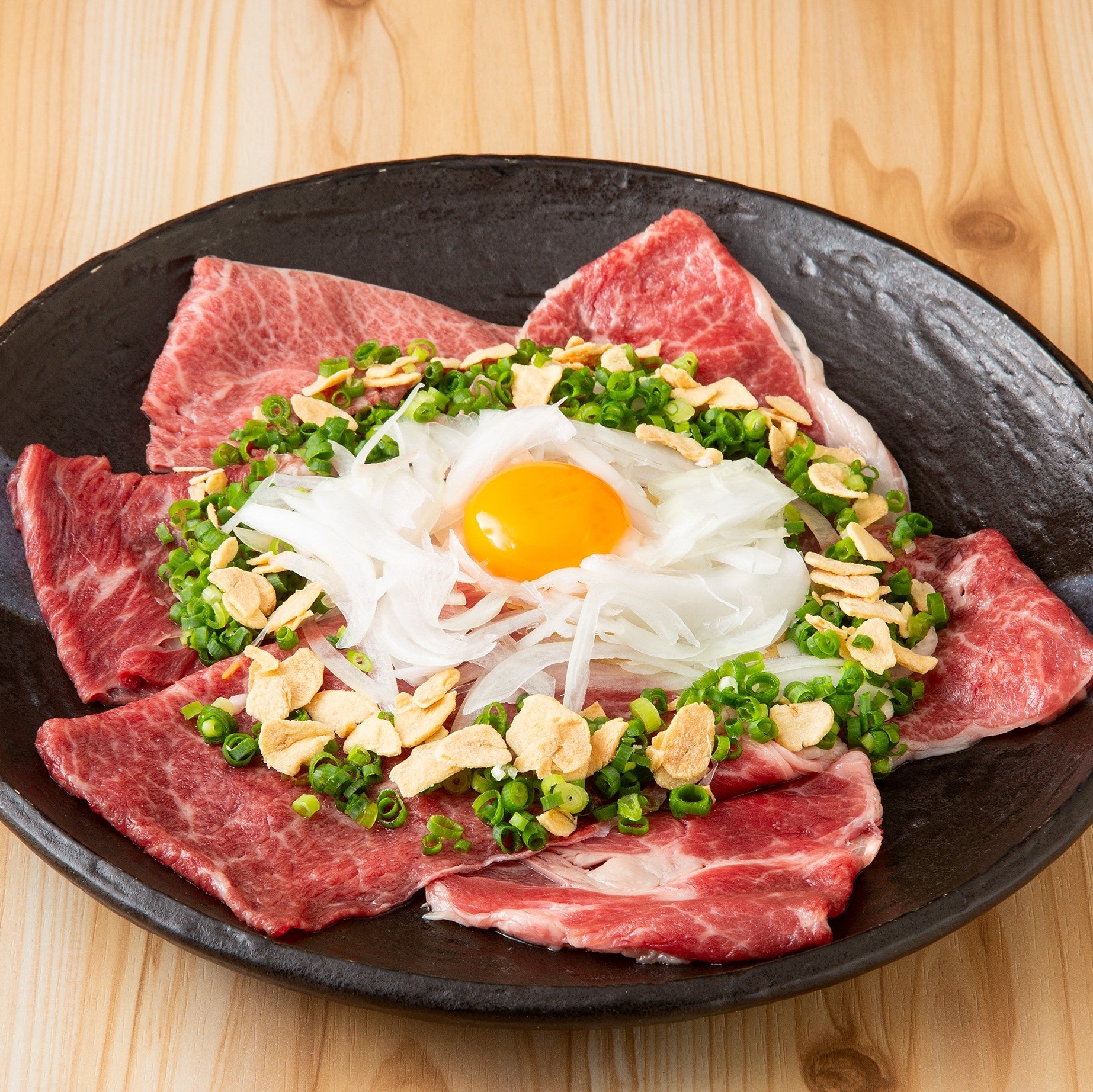 自家製特製ダレと濃厚卵黄をくぐらせシャキシャキオニオンを巻いてどうぞ!