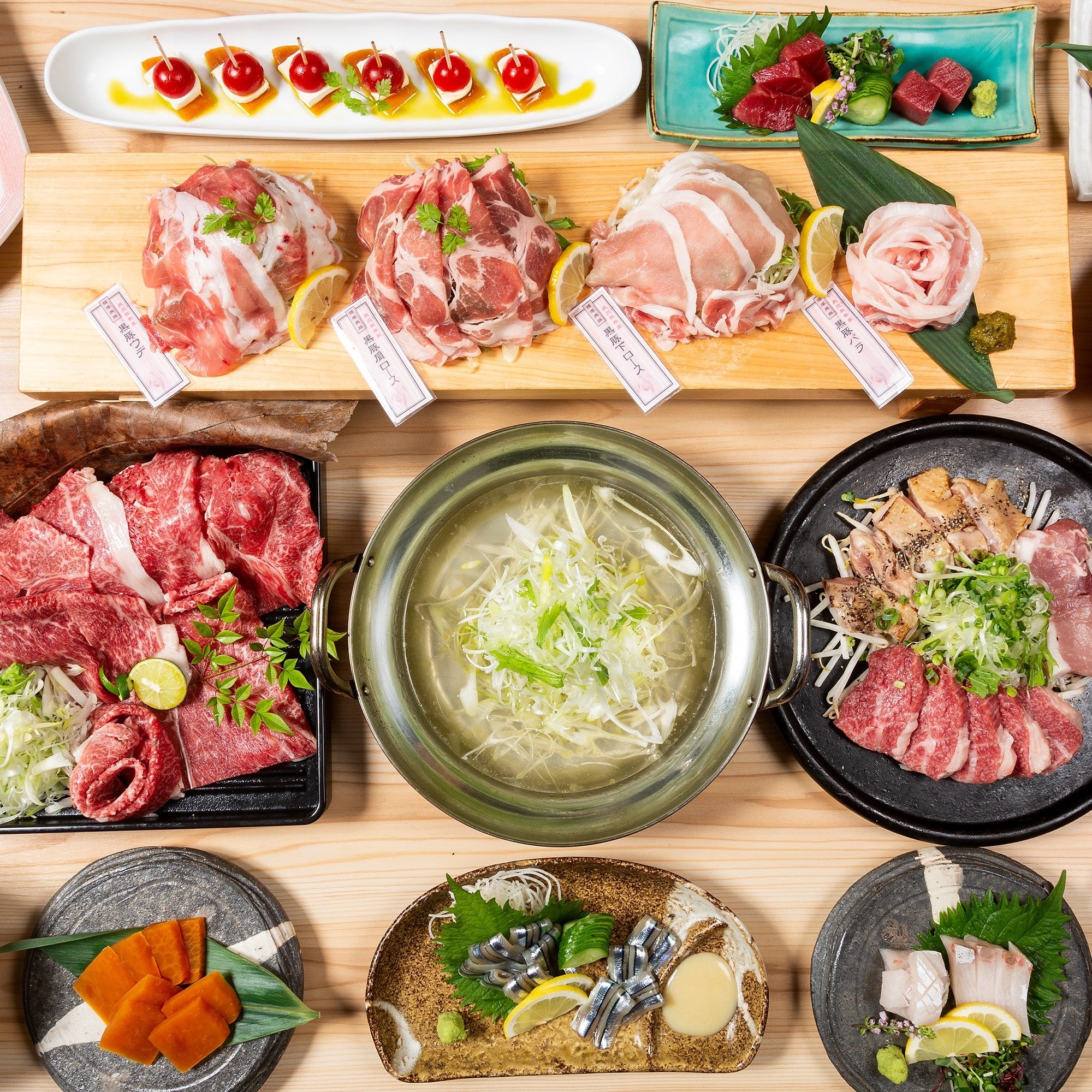 黒豚しゃぶしゃぶや桜島溶岩焼を始めとする贅沢料理、海鮮玉手箱や五感で味わう藁焼きといった鹿児島をちりばめた料理長こだわりの創作料理を提供する
