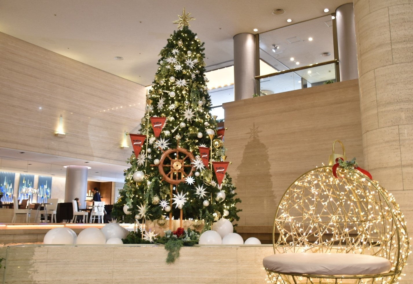 天井高17mを誇るメインロビーに面した水辺エリアに、高さ約4.8mのクリスマスツリーが登場。まるで大海原に浮かんでいるようにも見えるツリーには、出航のファンファーレを鳴らすトランペットや、旅先へと向かって操縦する舵など、豪華客船をイメージしたオーナメントを飾りました。ホテルのエントランスや通路、レストランなど、館内各所にもツリーやリースなどを飾り、クリスマスの高揚感を高めます。また、外周道路から正面玄関までの植込みにイルミネーションが灯り、ホテルへご来館いただく皆さまを、美しい幻想的な世界へと導きます。