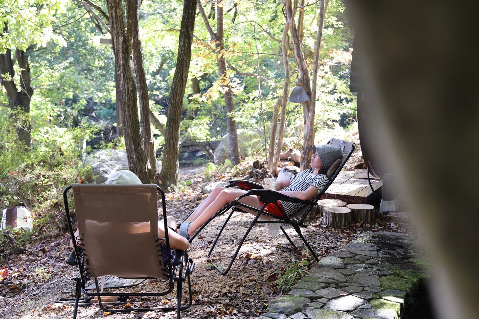 ととのい:リクライニングチェアー2脚、水風呂用プールチェアー2脚、焚火台1台