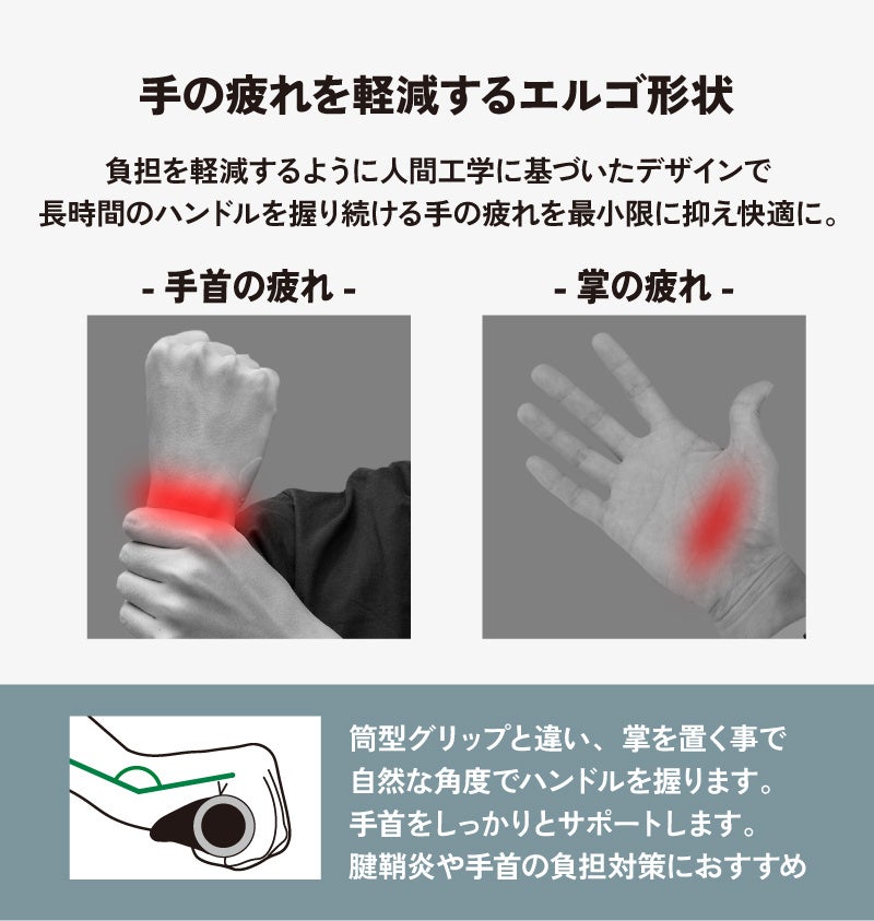 [手の疲れを軽減するエルゴ形状]