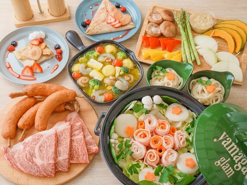 冬は鍋が美味しい季節。豆乳ブーケ鍋では、山形県産米の子豚と地元もちやかたのとろとろ餅を使用し、蓋を開けると花束が出現。心も体も温まるメニューです。あたたかい鍋料理を中心に、山形牛ステーキや舟形マッシュルームのアヒージョなど山形の食材の魅力が詰まった料理を堪能できます。