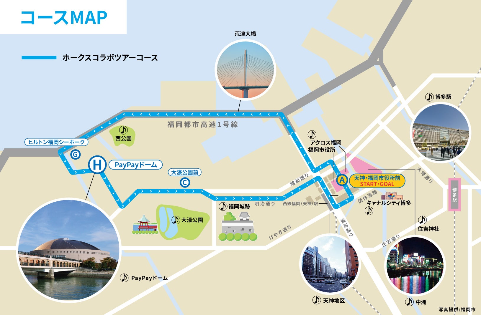天神・福岡市役所前 → 福岡都市高速(天神北ランプ~百道ランプ) → PayPayドーム(ドーム内乗り入れ・★PayPayドームツアー) → 明治通り → 渡辺通り → 国体道路→ 天神・福岡市役所前