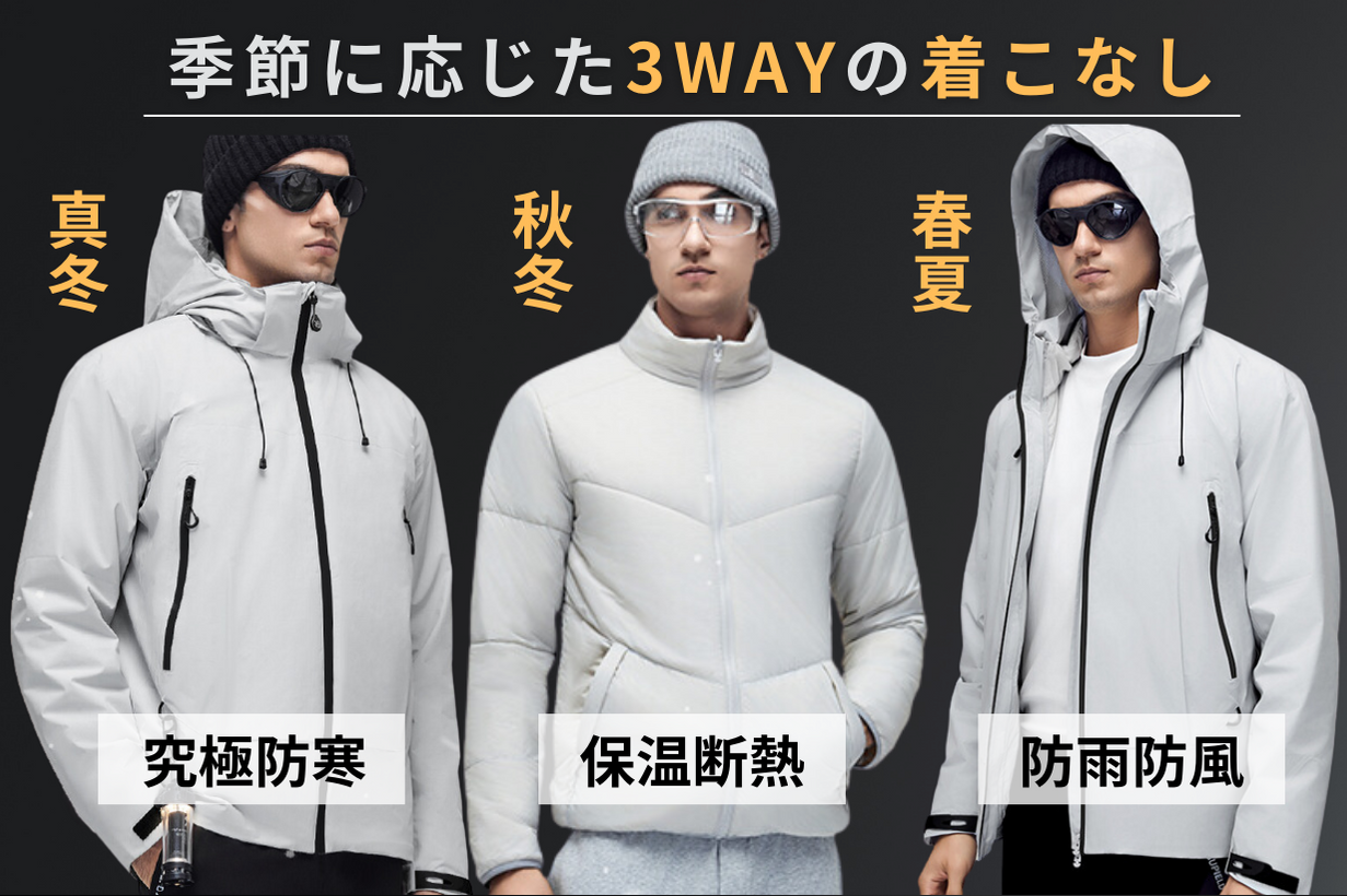 NASA宇宙服の断熱素材技術を採用した高機能防寒ジャケット。アウターとライナーダウンを専用のファスナーで連結し、1着3通りの着こなしができる3WAY仕様に進化!真冬の極寒、春の長雨、夏の湿気、秋の暴風をこのジャケット1着ですべてが完結!高機能性を誇り、日常だけでなく、ウィンタースポーツやアウトドアにも最適!