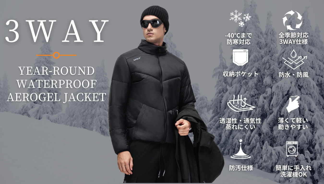 DADAは、最先端技術により保温性・断熱性を損なうことなく「薄さ・軽さ・透湿性」を備えた複合材として開発されたエアロゲル素材の入手に成功し、これまで同素材を活用したファッションシリーズを販売を実施。総額約1.4億円以上の応援購入とともに、ご愛用者の皆様から多くのご要望をいただいたことから、この度、”3IN1”エアジャケットを企画、日本での独占開発および販売に至りました。